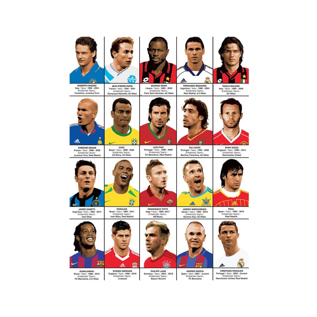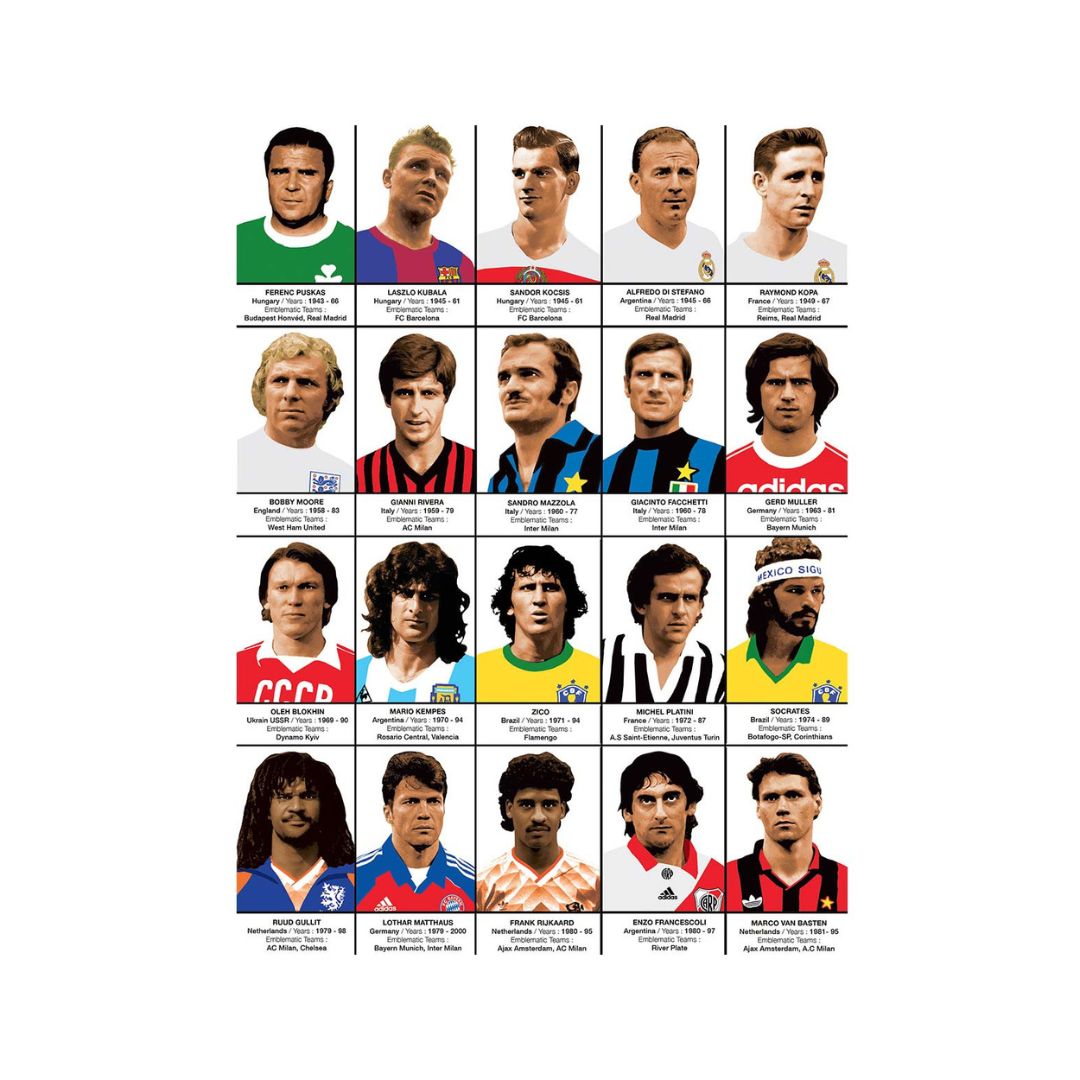 Through his innovative and contemporary compositions, the illustrator Olivier Bourdereau combines encyclopaedic information and design. Here, he lists the football players who have marked the history of the game