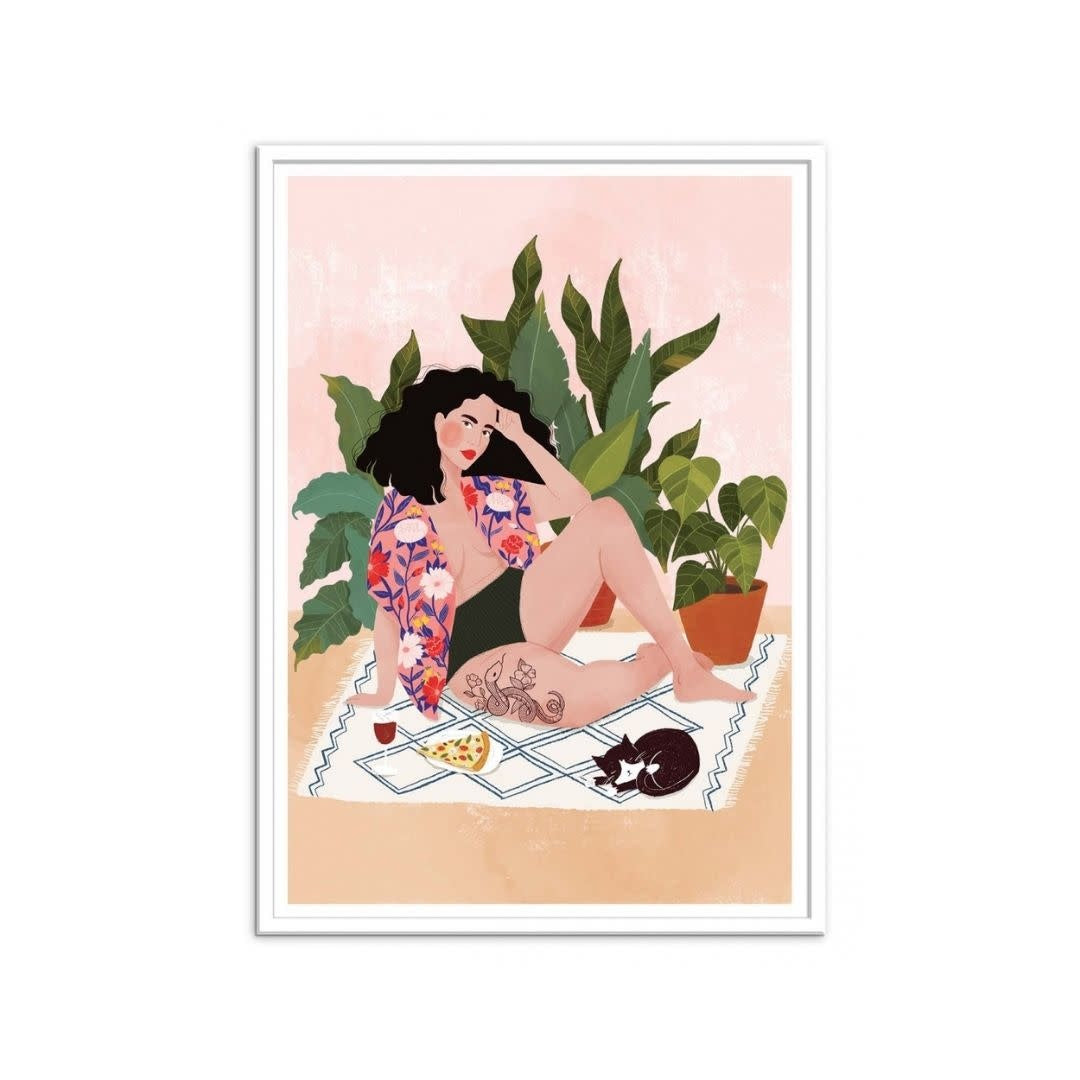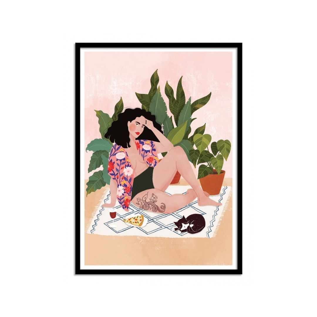 Illustrator Maja Tomljanic captures moments from women's lives. These everyday portraits invite you to take care of yourself and bring balance and serenity to your decoration. Here: a lazy Sunday around a pizza.
