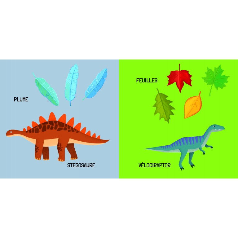 A superb complete box containing a 10-page book, a 40-piece puzzle and 10 dinosaurs to assemble and place on the puzzle, to learn to recognize and associate the elements and words.