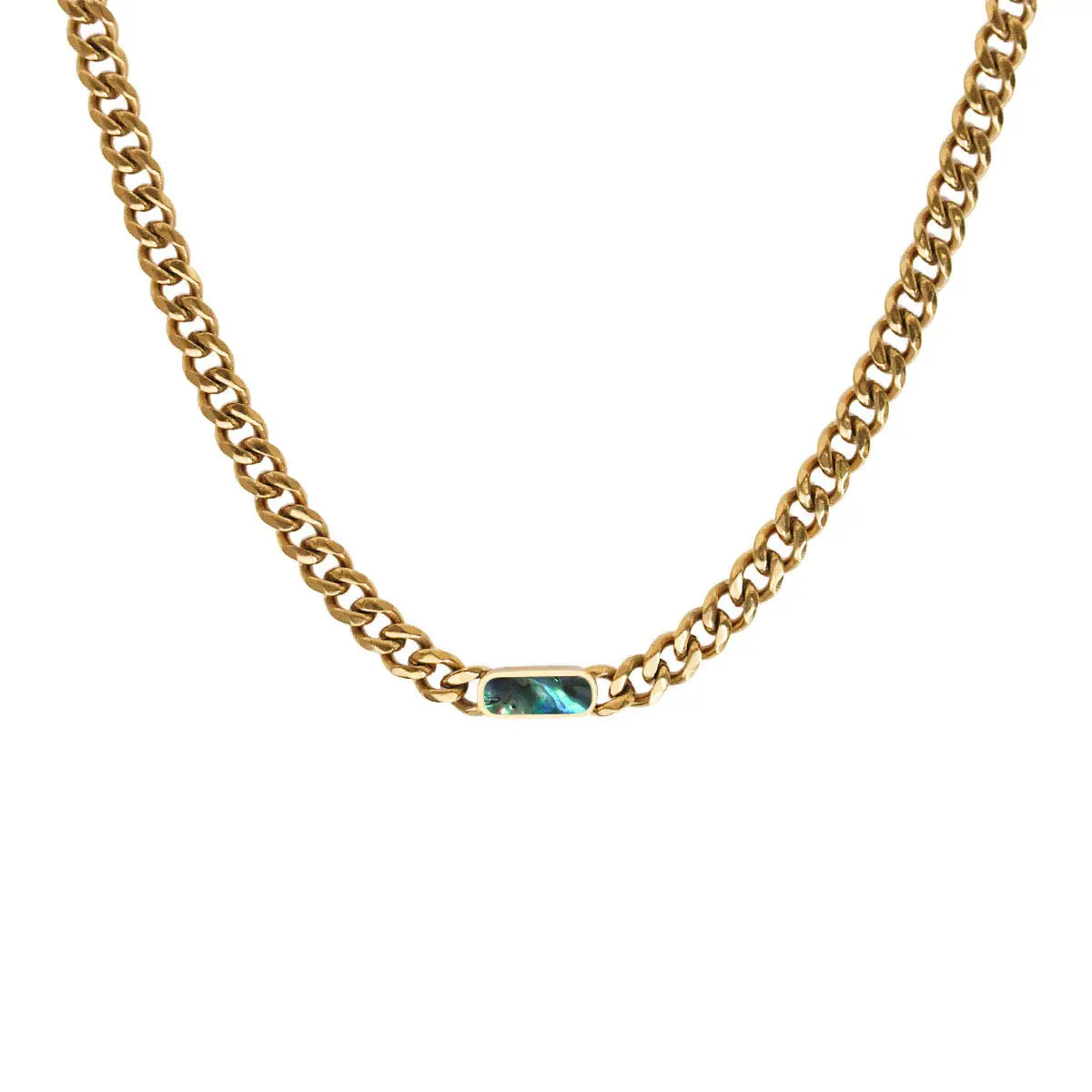 De Columba-lijn is een serie fijne vergulde sieraden van roestvrij staal die bestaan uit een grote netketting en een natuursteen.
