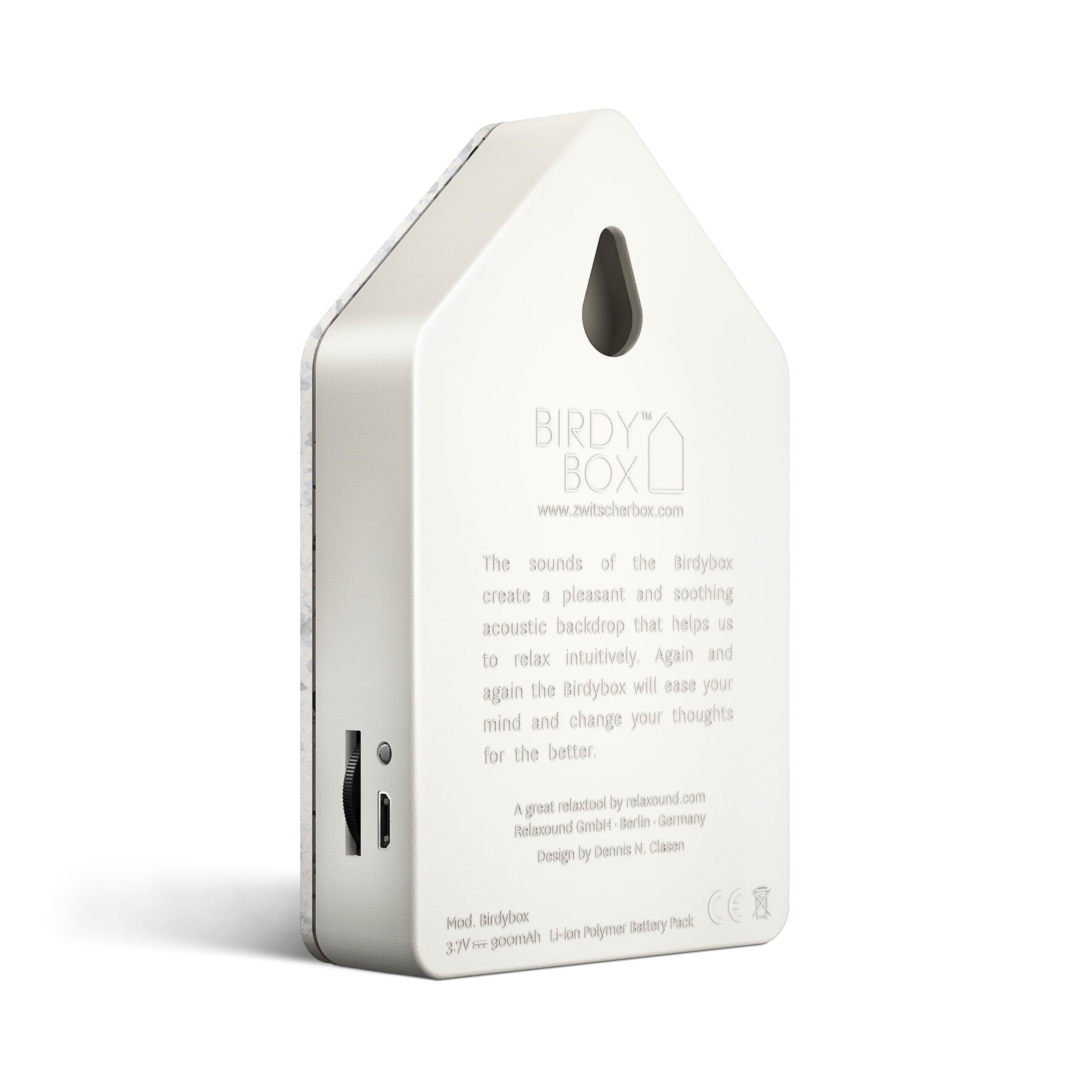 Les sons naturels sont activés par un détecteur de mouvement lorsque vous passez devant la boîte. Le volume peut être réglé individuellement. Grâce à sa taille compacte et à son fonctionnement pratique sur piles, vous pouvez profiter de l'effet de votre Birdybox où que vous soyez. Elle peut être placée à côté de la machine à café, sur une étagère, sur un bureau ou près d'une fenêtre : un moment de détente est toujours le bienvenu, où que vous soyez.