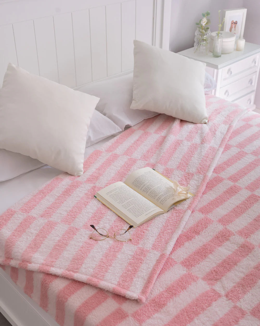 Un plaid rose et blanc pour passer l'automne et l'hiver bien au chaud. (Cliquez sur Détails pour plus d'informations.)