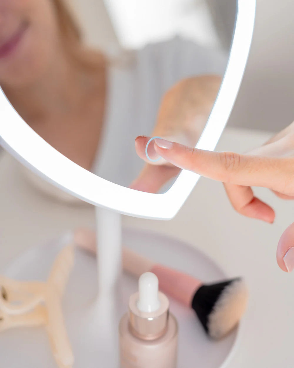 Son utilisation est intuitive grâce à son bouton tactile, vous permettant d'allumer le miroir, de choisir le ton de lumière idéal pour vos besoins et d'ajuster l'intensité de la lumière en fonction de vos préférences.