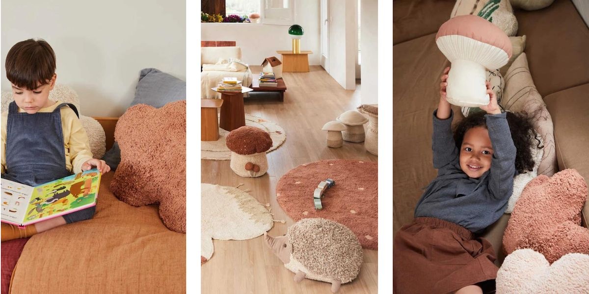 On y retrouve des tapis lavables, bien entendu, mais aussi des poufs et des coussins à croquer.