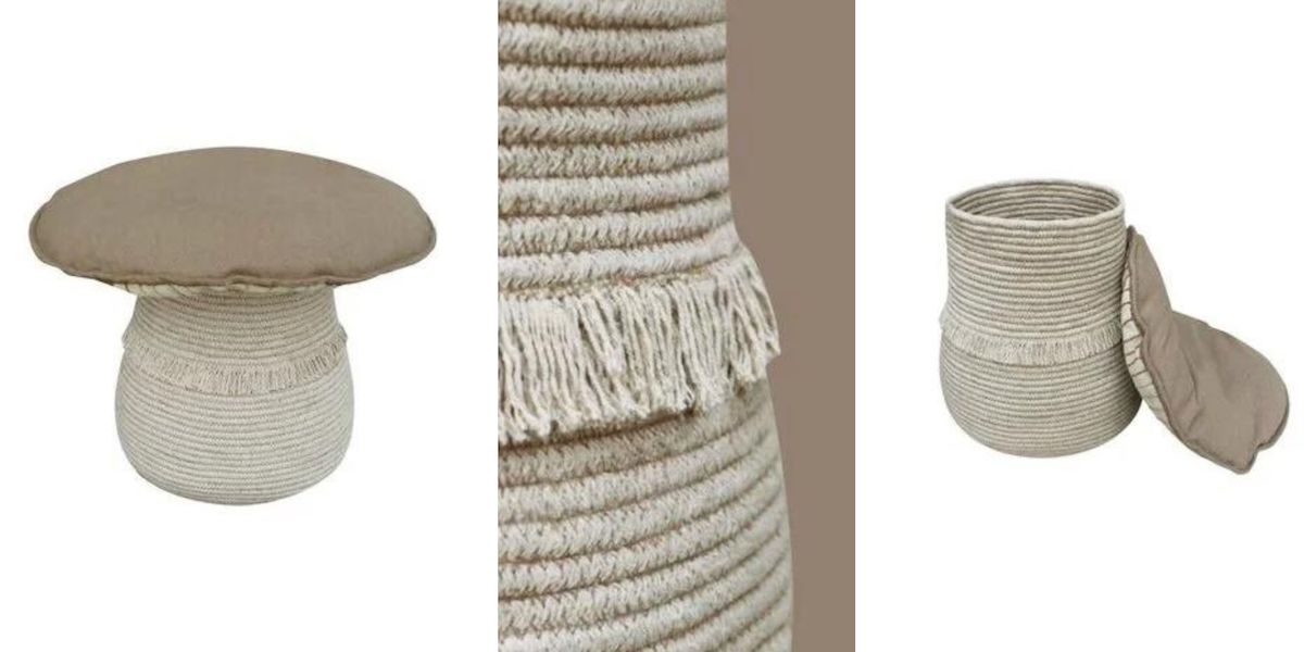 Le panier est légèrement incurvé, il est composé de cordes tressées avec du fil provenant de bouteilles PET recyclées associées à du coton et possède des franges décoratives (qui représentent l'anneau du champignon). Le dessus du panier est un coussin en toile de coton doux de couleur naturelle et marron clair avec des coutures décoratives qui simule le « chapeau » d'un champignon. Haut de 45 cm, il ne manque que lui à votre déco automnale !