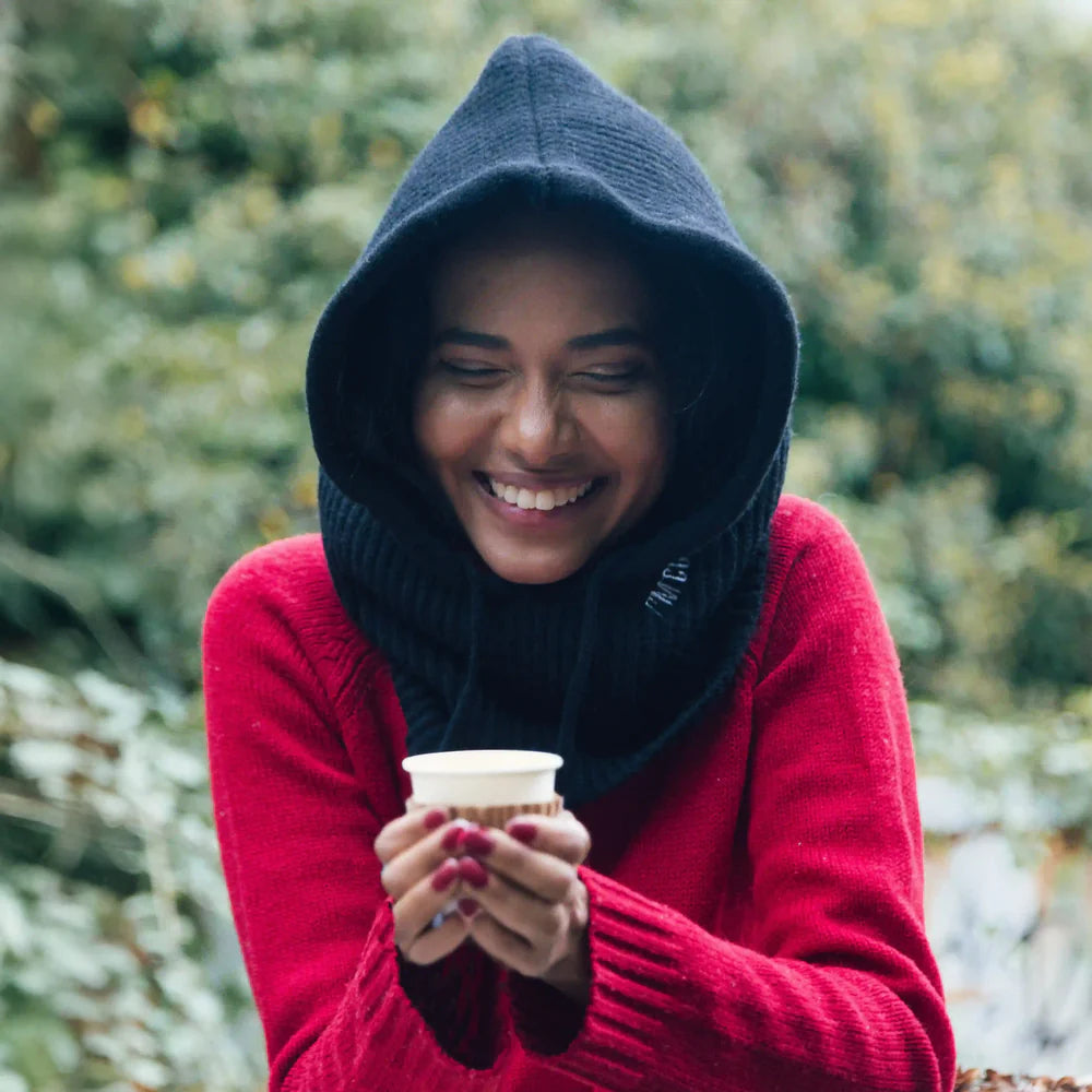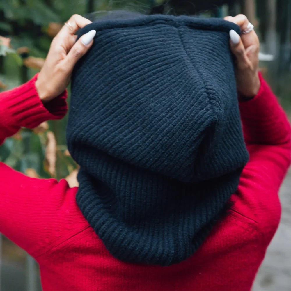 - It's a 3-in-1 accessory: it protects your head like a hat, your neck like a scarf, and part of your face from the cold.