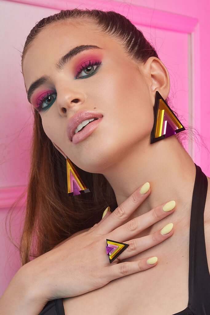 Graphic, bold, and furiously stylish, the R-Line earrings combine angular shapes and mirrored effects for an ultra-contemporary look. Composed of successive triangles in matte black, yellow, pink, and purple mirrored effects, they are subtly engraved for even more character. A statement piece, light and arty, for all those who like to assert their style with originality.
