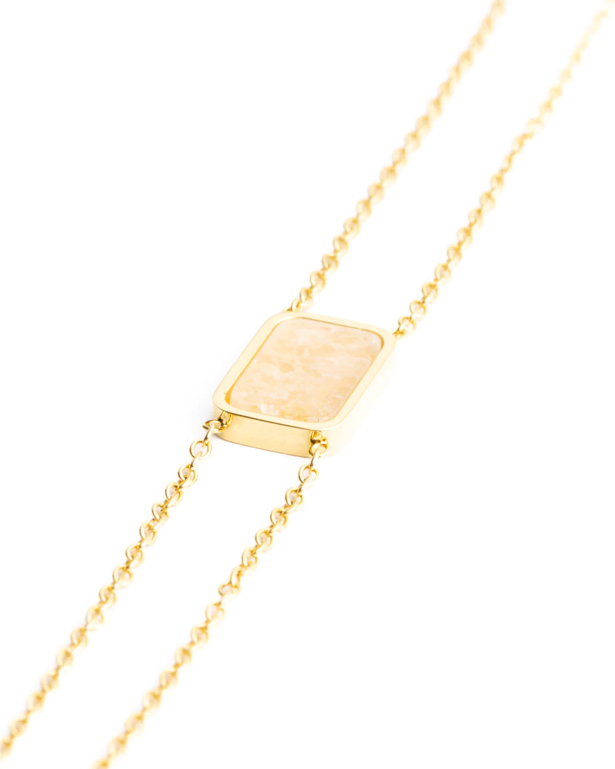 The Kala bracelet is adorned with a beautiful flat white jade stone. Its chain is made of stainless steel, it is adjustable. White jade is associated with purity and serenity.