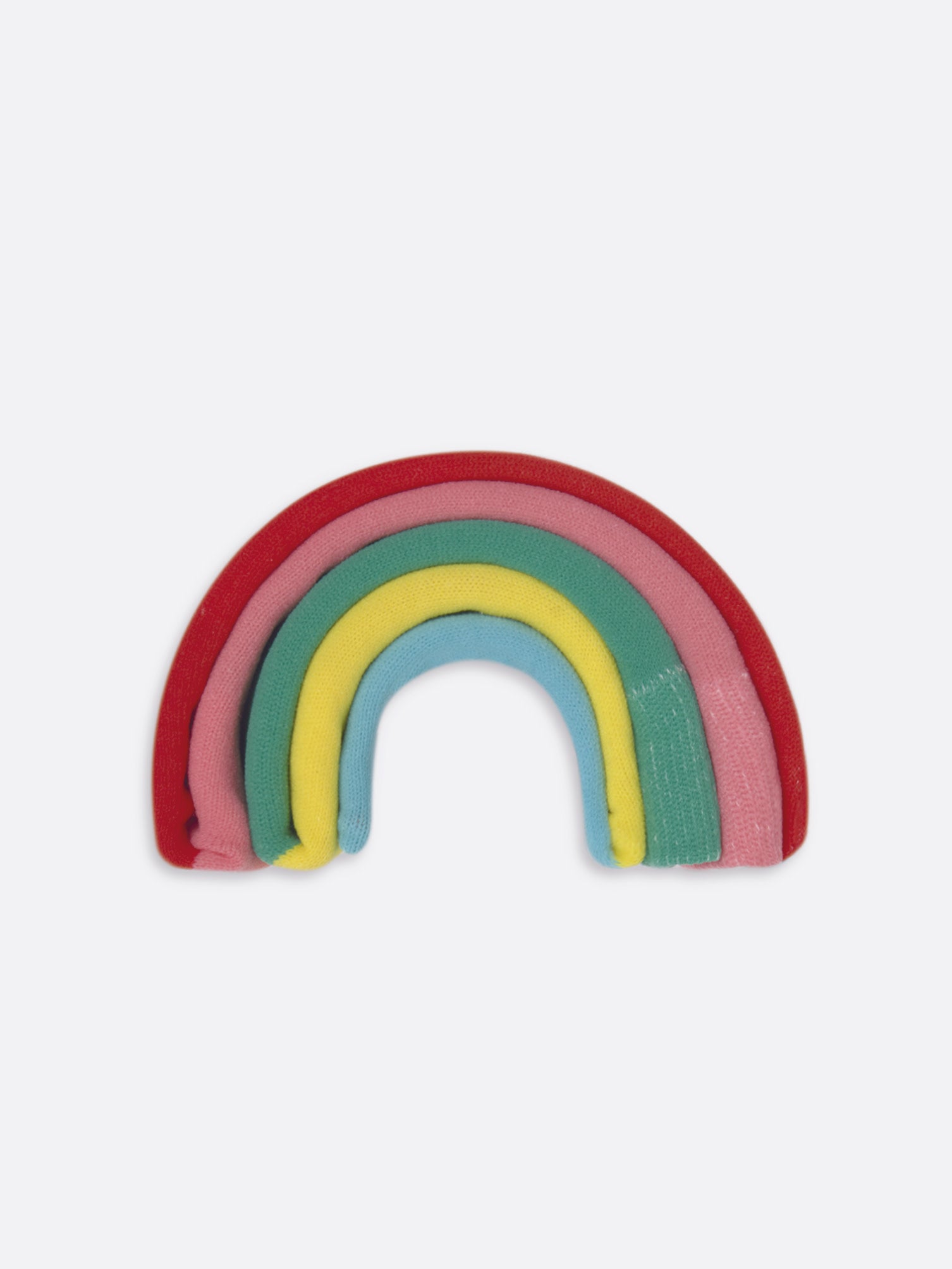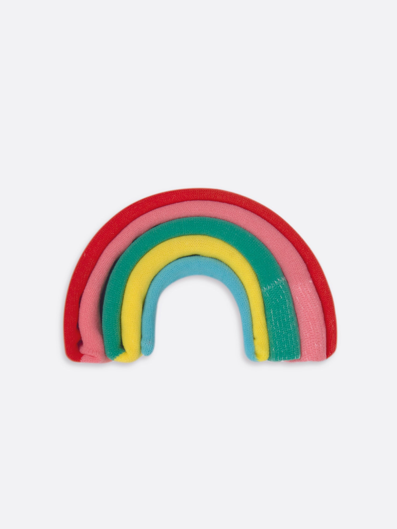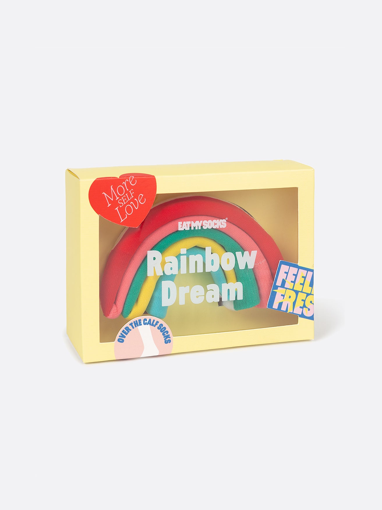 Pair of colorful, fun and comfortable socks in the shape of a multi-colored rainbow. Unique size. Sold in fun packaging.