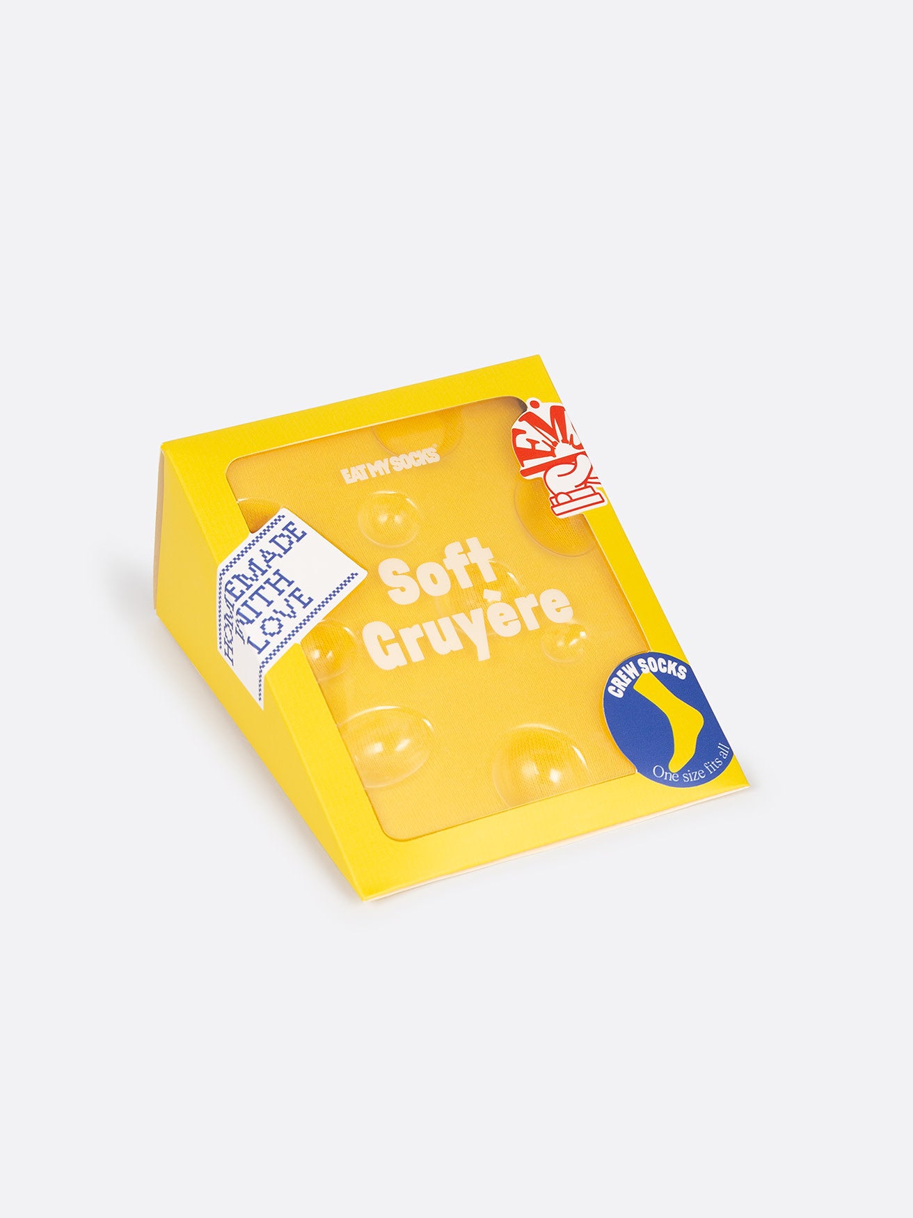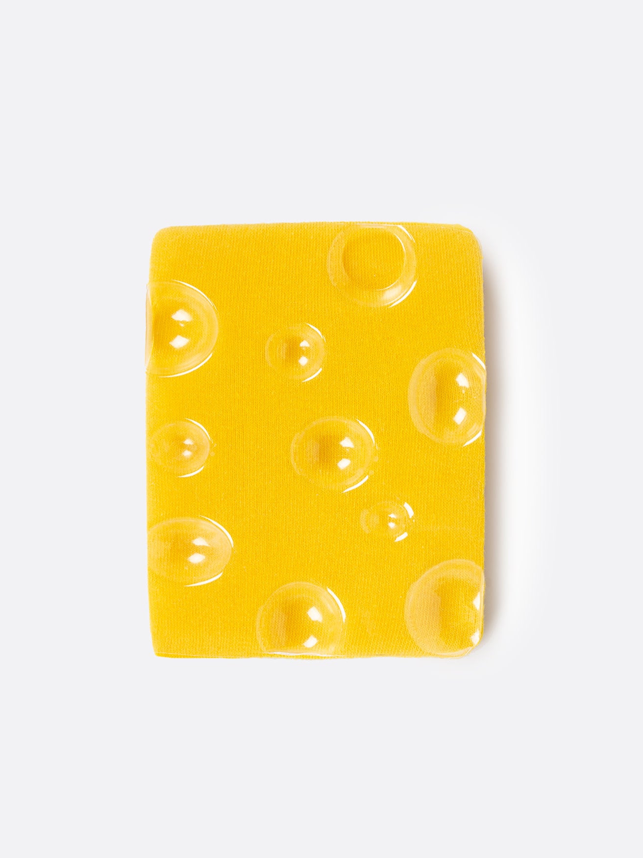 Pair of fun and comfortable socks in the shape of a delicate gruyere cheese. Unique size.