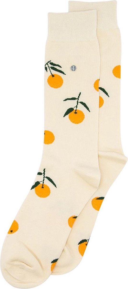 The Alfredo Gonzales tangerine pattern socks, in white cotton, are of high quality. A 168 needle construction is used to create a very comfortable and durable sock.
