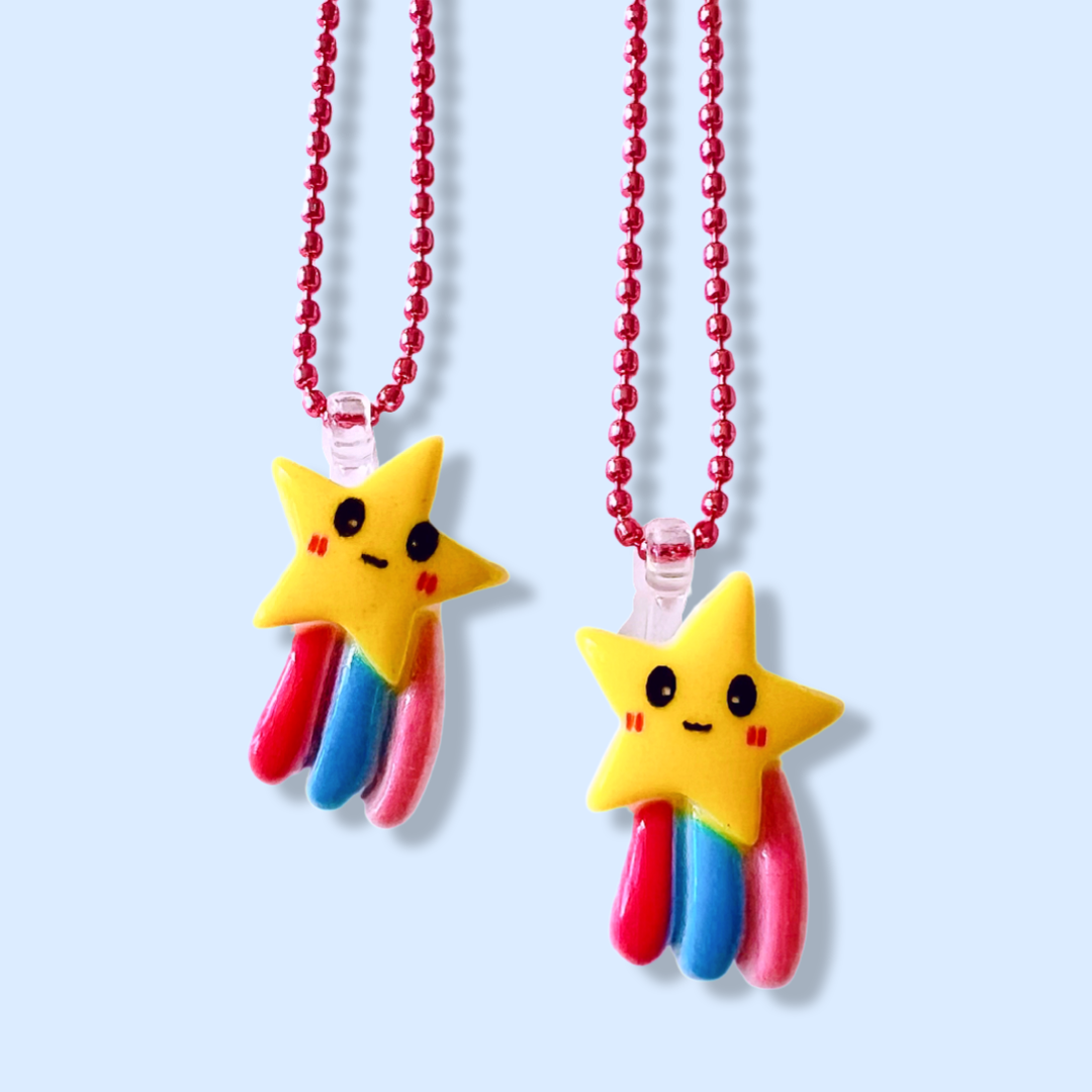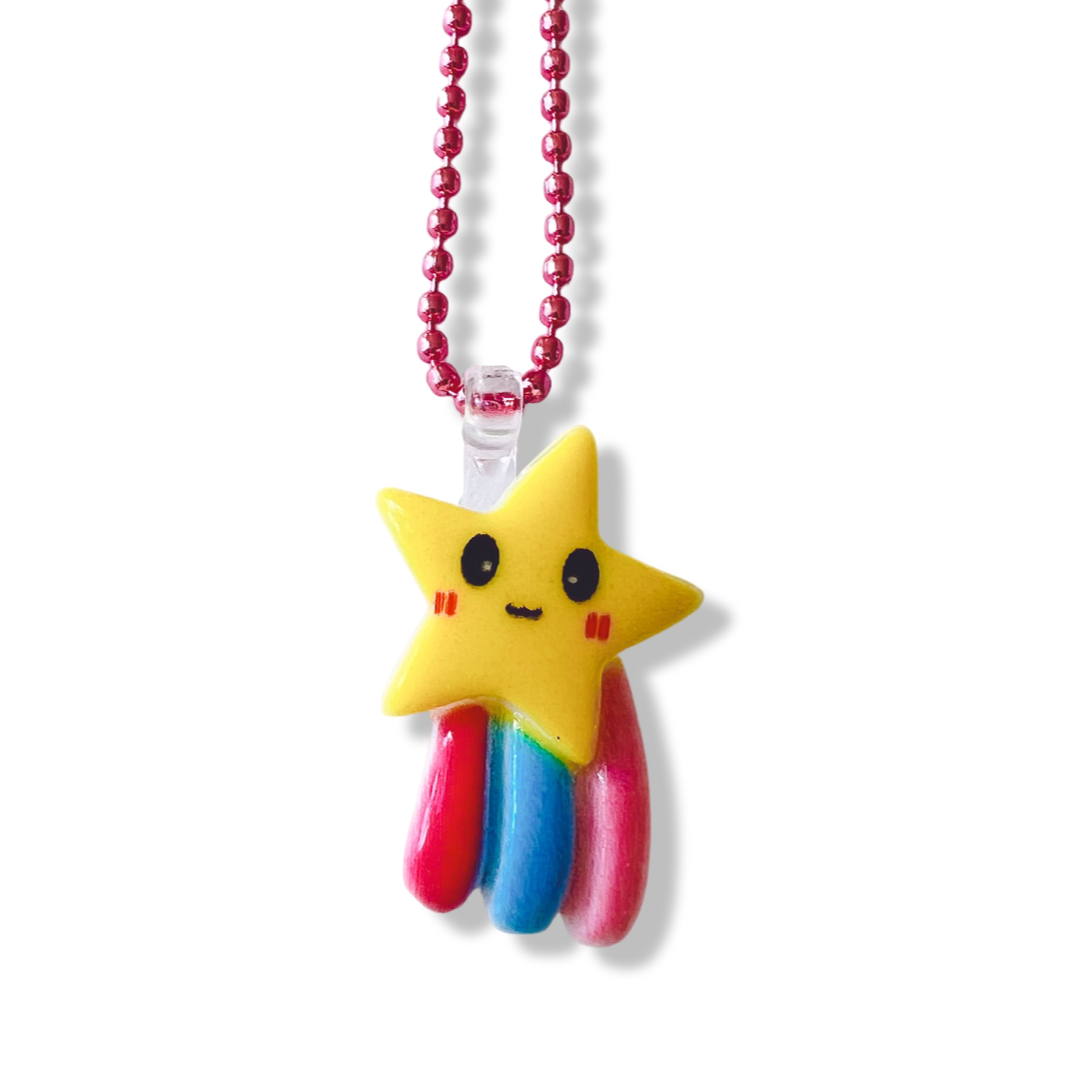 Cute little rainbow shooting star in our classic colored ball chain. Each necklace comes in a reusable clear acrylic gift box with our cute logo. Guaranteed nickel free! **WARNING** This item is not a toy and is not intended for use by children under three years of age. Necklaces contain small parts and may cause choking. Do not put in your mouth. Handmade in California Pop Cutie Popcutie gifts for kids, children, girls and girls