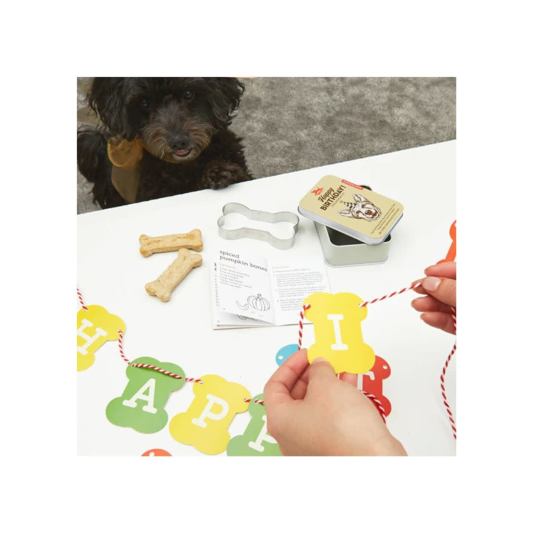 The kit includes: A dog treat recipe book, a bone-shaped cookie cutter, a banner and a party hat.