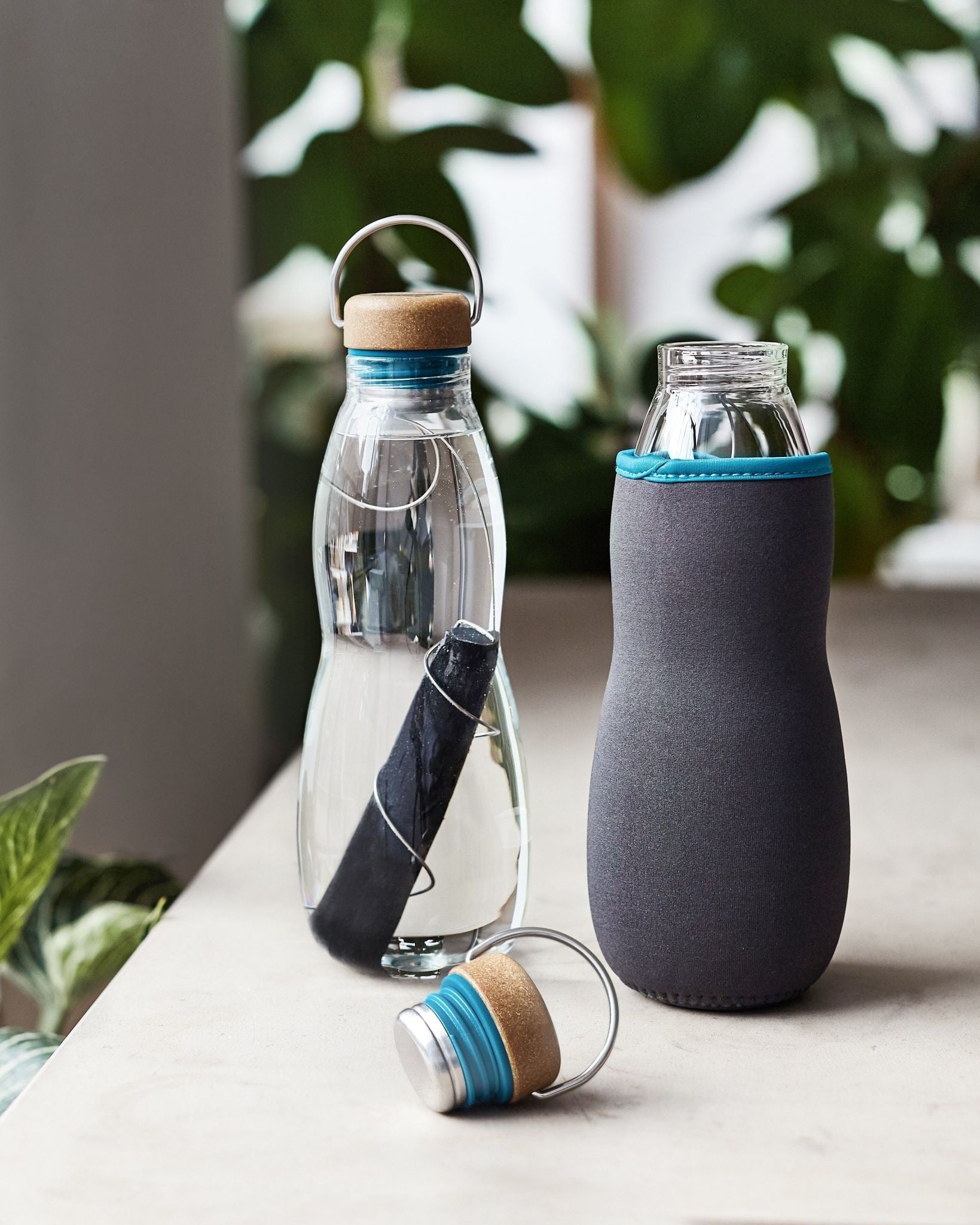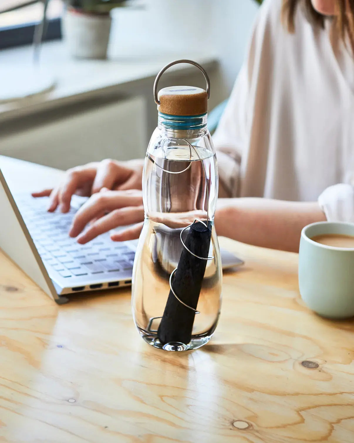 The Eau Good glass bottle is perfect for taking water with you whenever and wherever you want. It comes with a carbon filter that filters out chemicals from the water, balances the pH of the water and adds minerals.