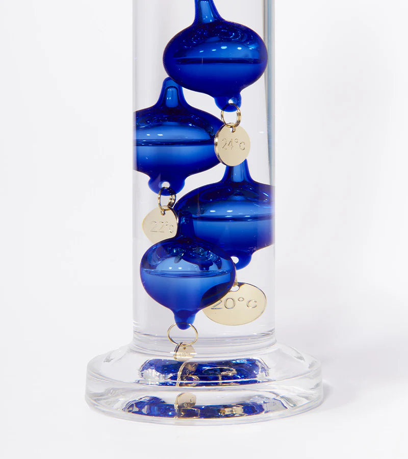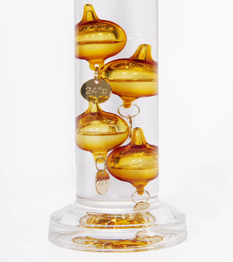 In the 17th century, Galileo Galilei was looking for a reliable way to measure temperature. He devised a system where calibrated spheres floated in a liquid according to temperature variations. This thermometer takes this ingenious idea and creates an elegant and decorative version, a blend of art and science.