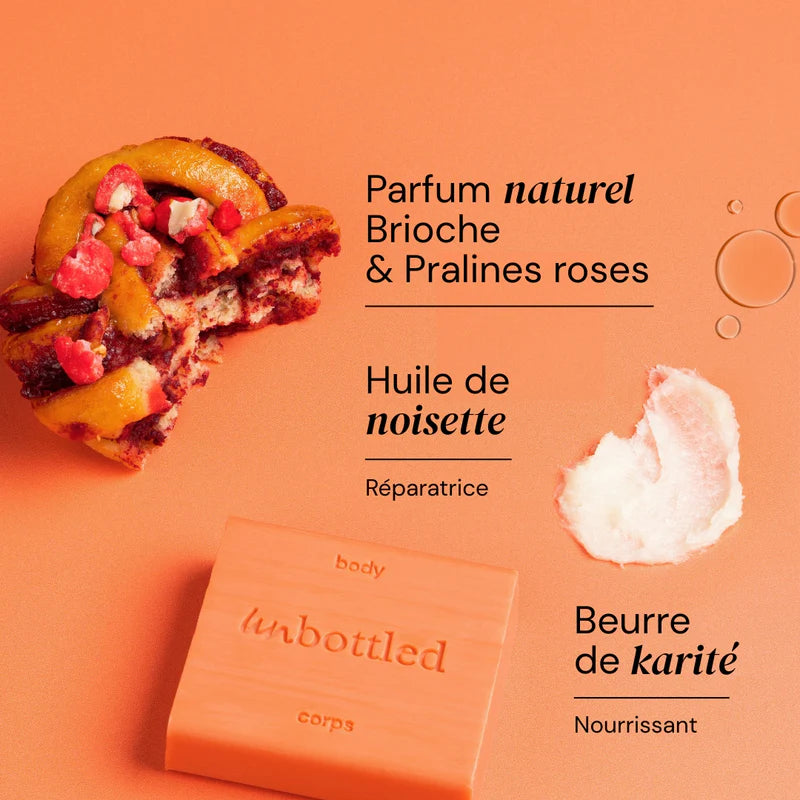 Unbottled Brioche and Praline Rose Gourmet Shower Gel: gently cleanses, nourishes the skin with hazelnut oil and shea butter, and envelops your body in a 100% natural sweet fragrance.