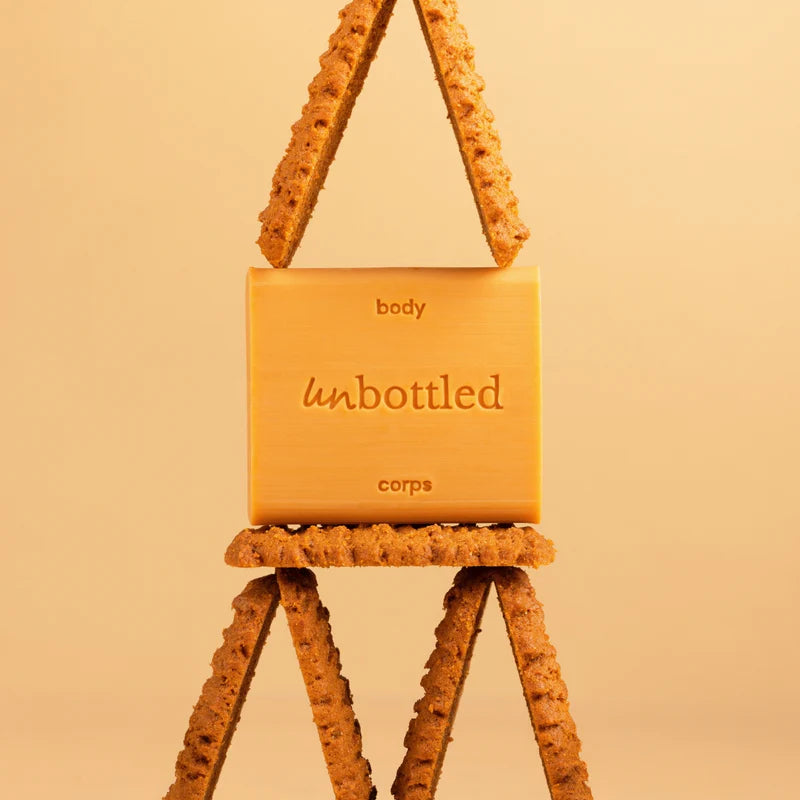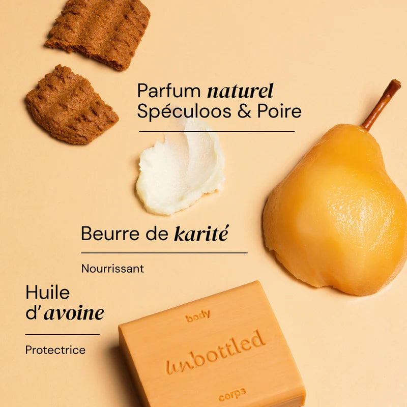 Dive into the softness of Unbottled's Speculoos and Pear bottle-free shower gel: a creamy lather, a delicious fragrance and naturally nourished skin.