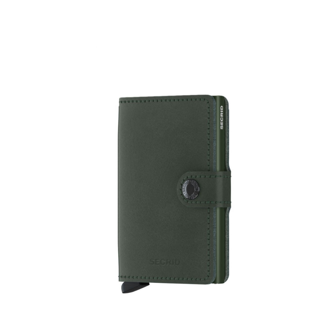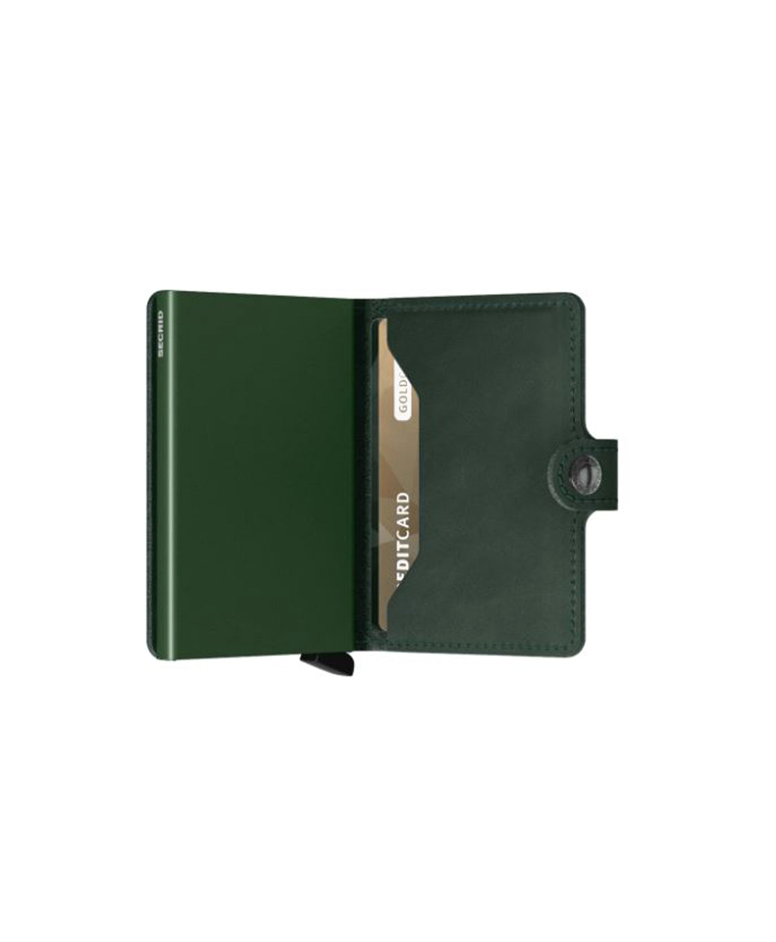 Cardprotector Secrid Original Green in European leather and aluminum, capacity 10 cards, RFID protection, banknote storage, Dutch manufacturing, compact and elegant design.