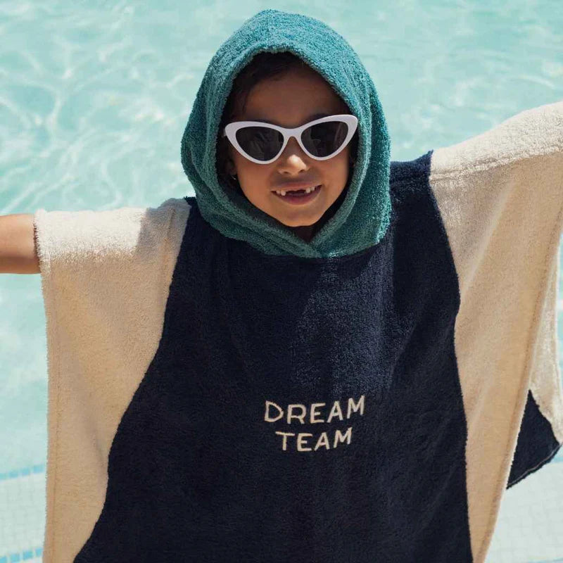 With its fresh shades of blue, white and green, this Chamaye terry poncho embroidered with "Dream Team" evokes the marine world and summer days at the seaside. Ultra soft, absorbent and easy to put on, it accompanies little sailors from the moment they get out of the water to their snack time in the sand.