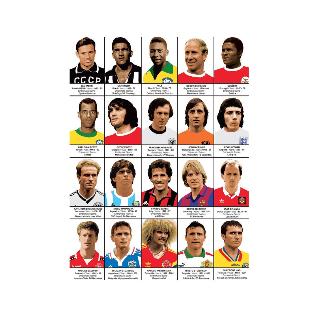 Through his innovative and contemporary compositions, the illustrator Olivier Bourdereau combines encyclopaedic information and design. Here, he lists the football players who have marked the history of the game