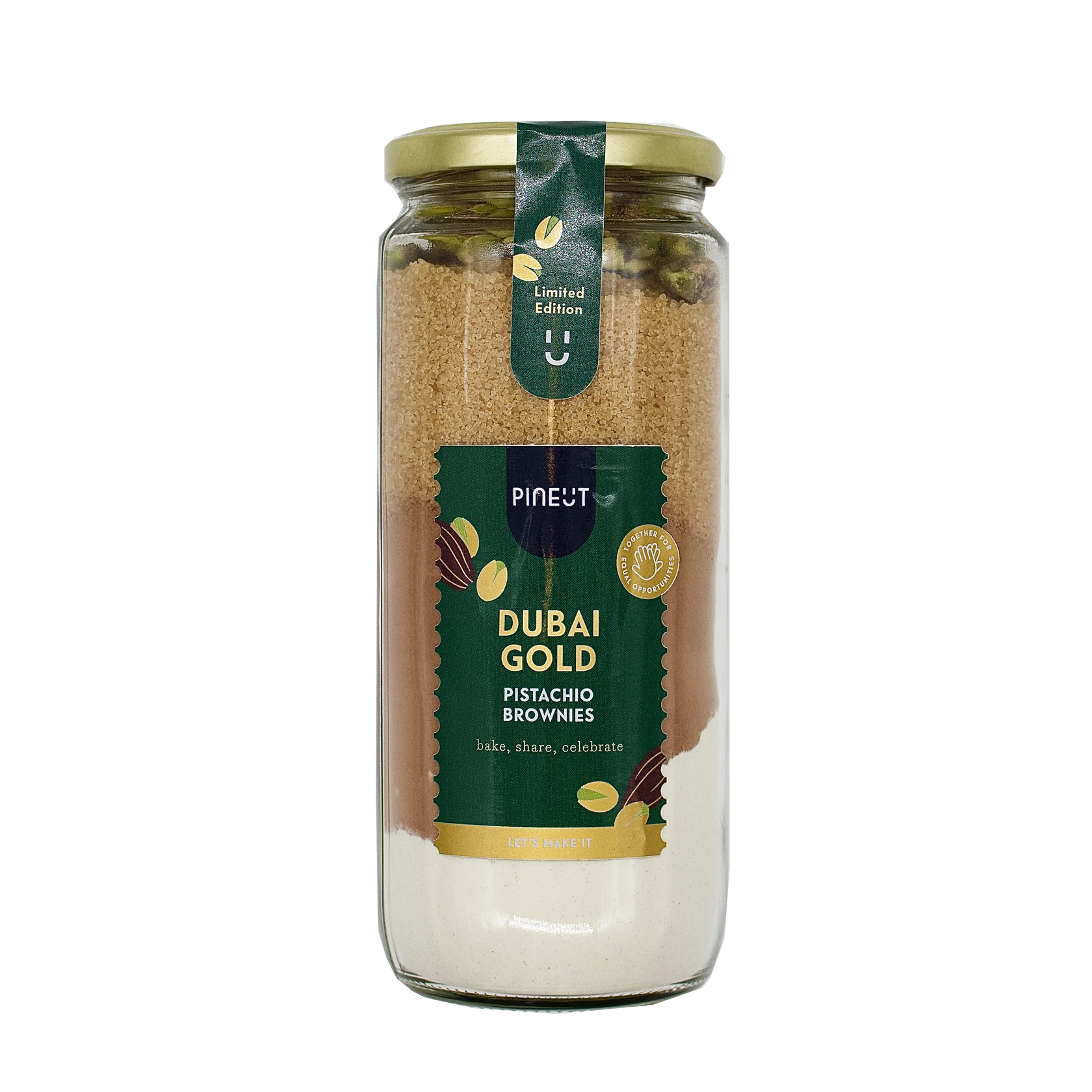 Treat yourself to a sensory journey with Pineut's Dubai Gold brownie mix . This refined blend combines the richness of dark chocolate , the spicy warmth of cardamom and cinnamon , and the delicate crunch of pistachios . The result? Brownies with a deep flavor, a melt-in-your-mouth texture, and a decidedly oriental charm.