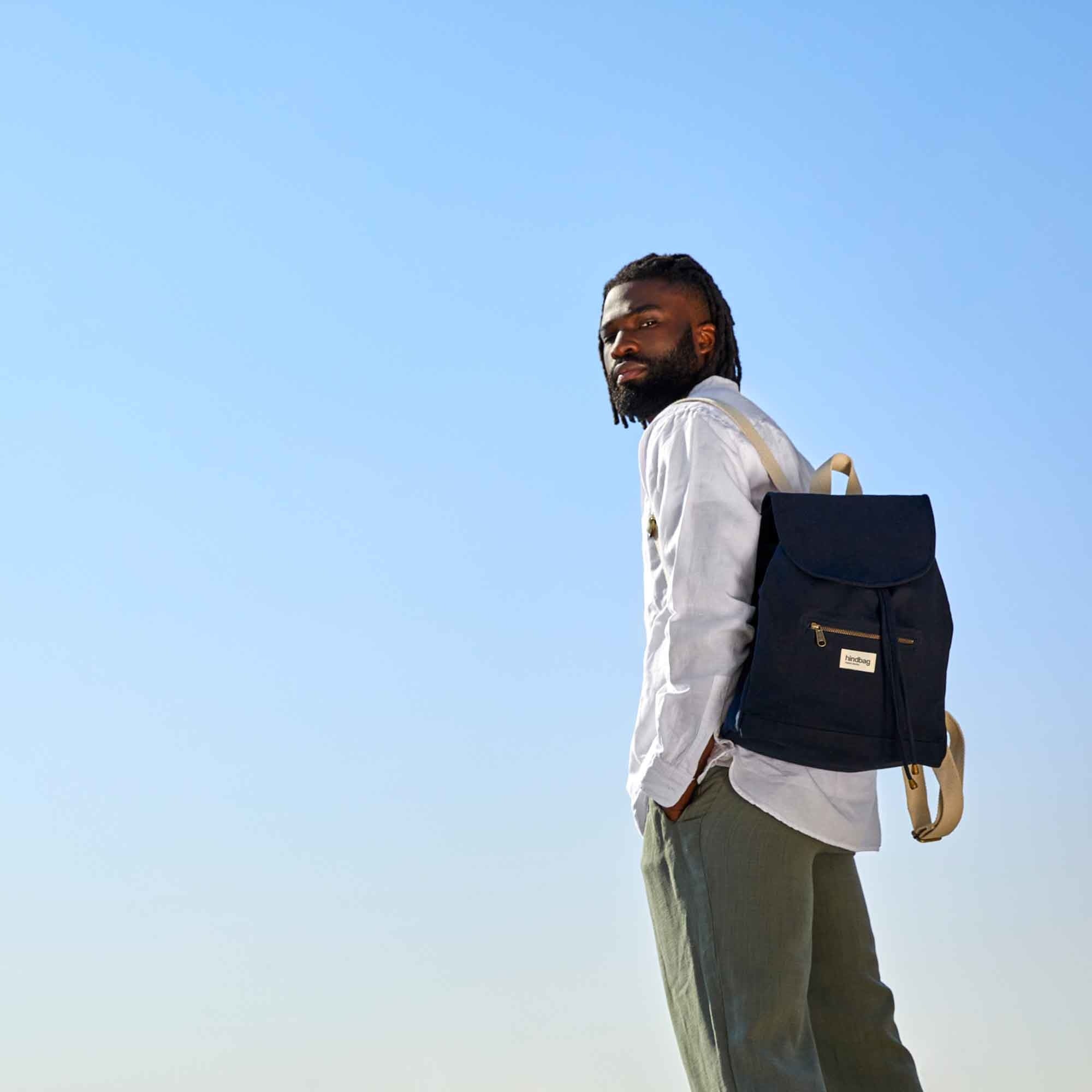 The backpack is made of thick organic cotton. It has adjustable shoulder straps, multiple external pockets and an internal compartment for a laptop or tablet.