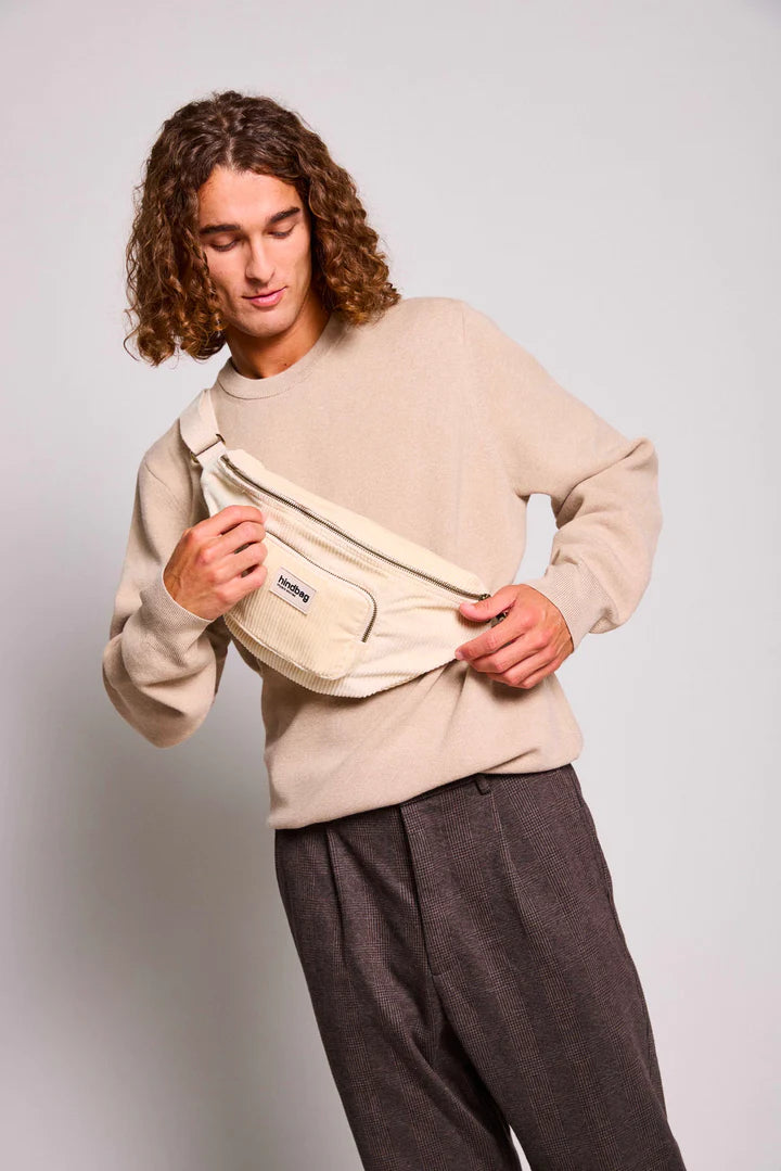 The XL Sofia belt bag in beige corduroy is the perfect ally for those looking for practicality and style . No more bulky handbags: with its 2 exterior zipped pockets , quickly access your phone, bank card, passport or keys without wasting time.