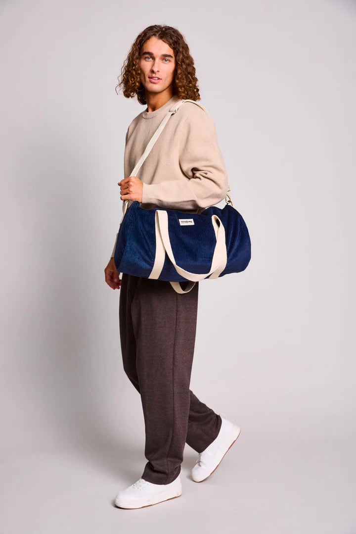 With its navy corduroy , Simon fits perfectly with the autumn trend , and its patterned linings add a touch of whimsy. Available in several colors, this duffel bag will adapt to all styles.