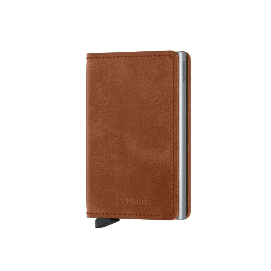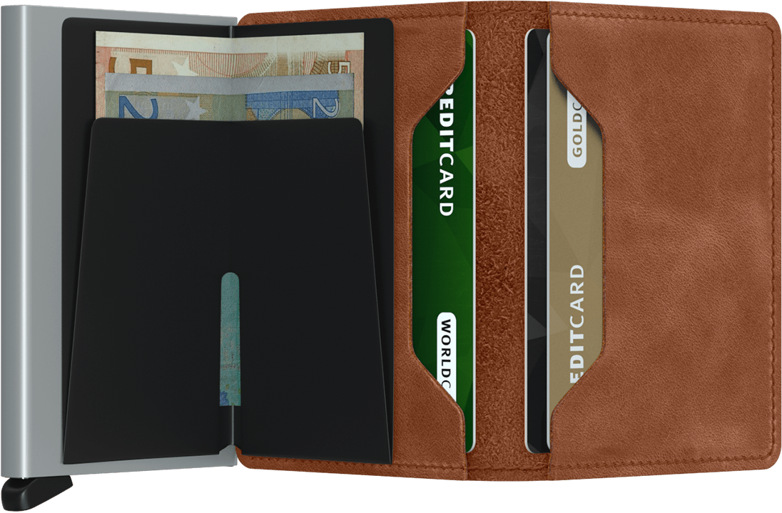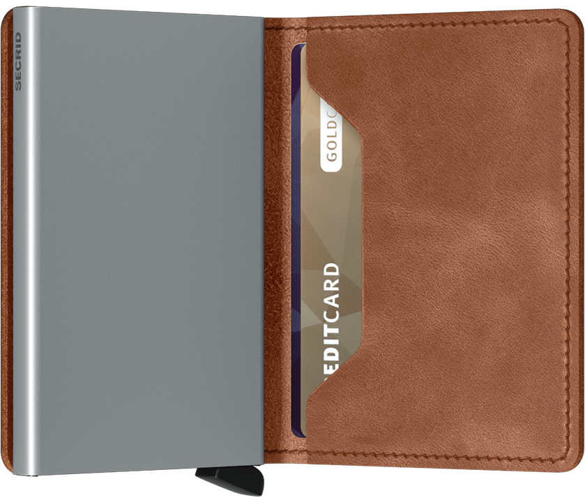 Slimwallet Secrid Vintage Cognac and Silver: RFID wallet in genuine cognac leather with silver aluminum casing, capacity for 10 cards, compact and durable.