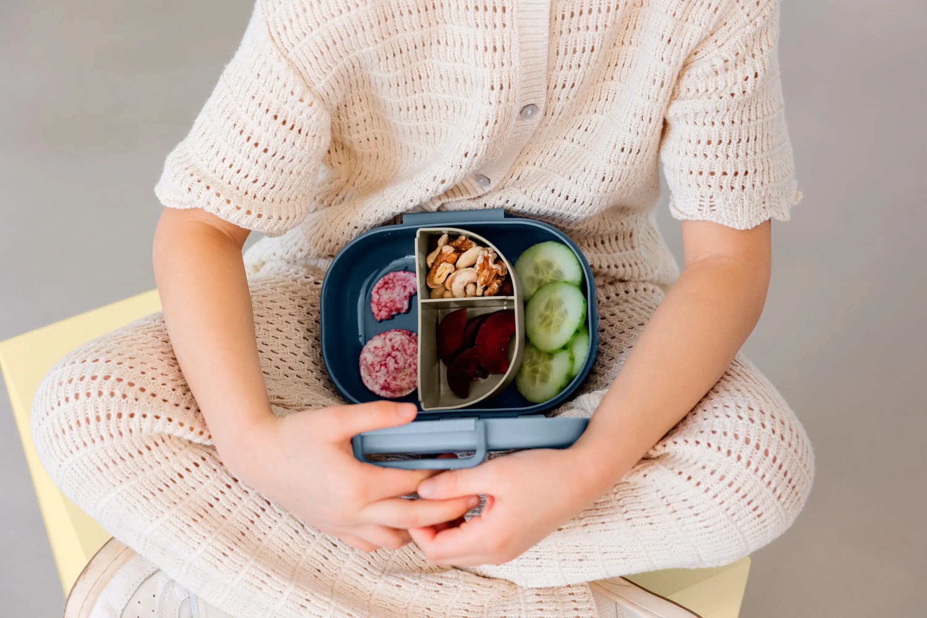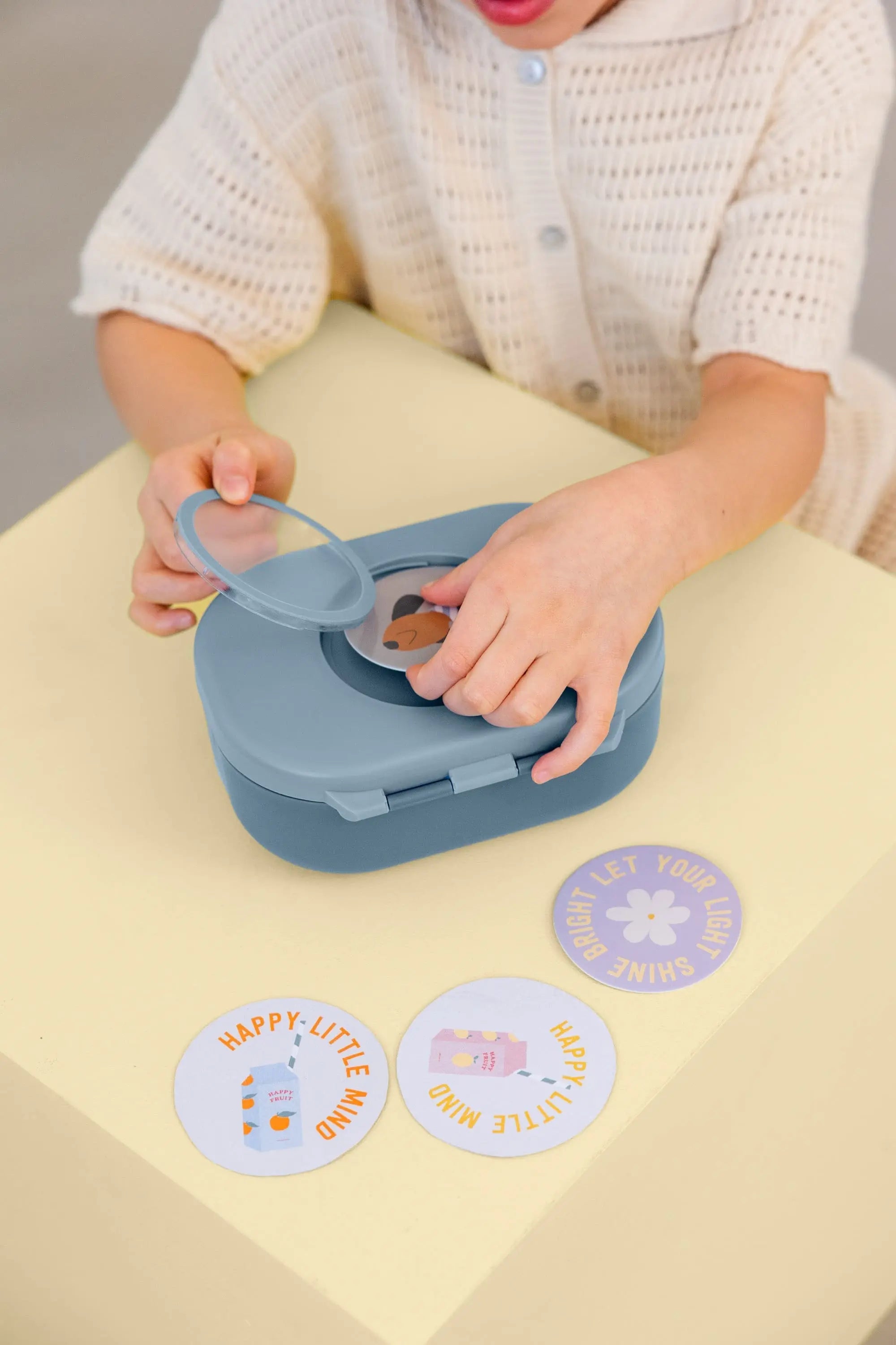 Practical and clever, it features a flexible, two-compartment container, a smart internal layout to prevent confusion, and a secure silicone ring closure. Its interchangeable inserts and QR code offer endless personalization possibilities, allowing each child to express their creativity.