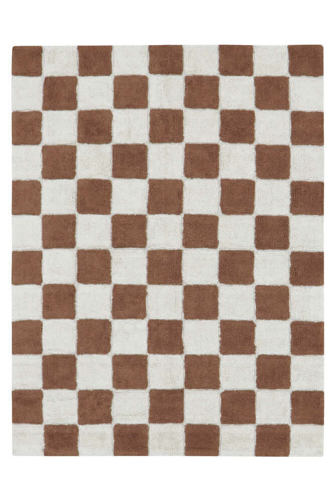 This washable cotton rug features a checkerboard pattern inspired by vintage kitchen tiles. It is available in one size with a choice of bold contrasting shades of dark grey or caramel brown combined with natural. There RugCycled® base and natural cotton. This traditional pattern with a modern twist offers a soft underfoot feel in the nursery, baby's room and general home decor.