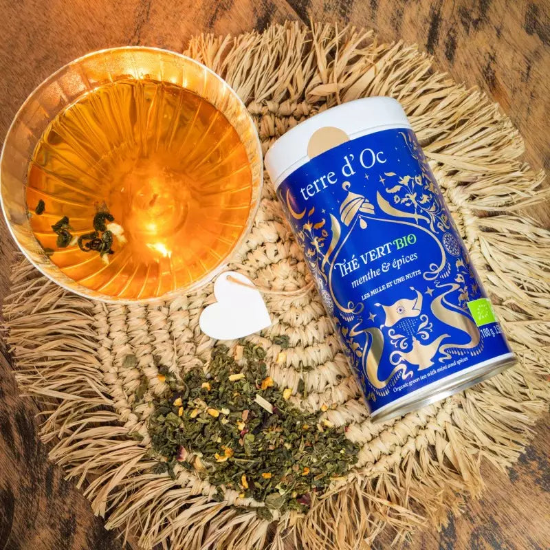 Dive into an enchanted Christmas with this organic Terre d'Oc green tea . Inspired by the Arabian Nights, it combines the invigorating freshness of mint and hibiscus with the warm, spicy notes of oriental traditions.