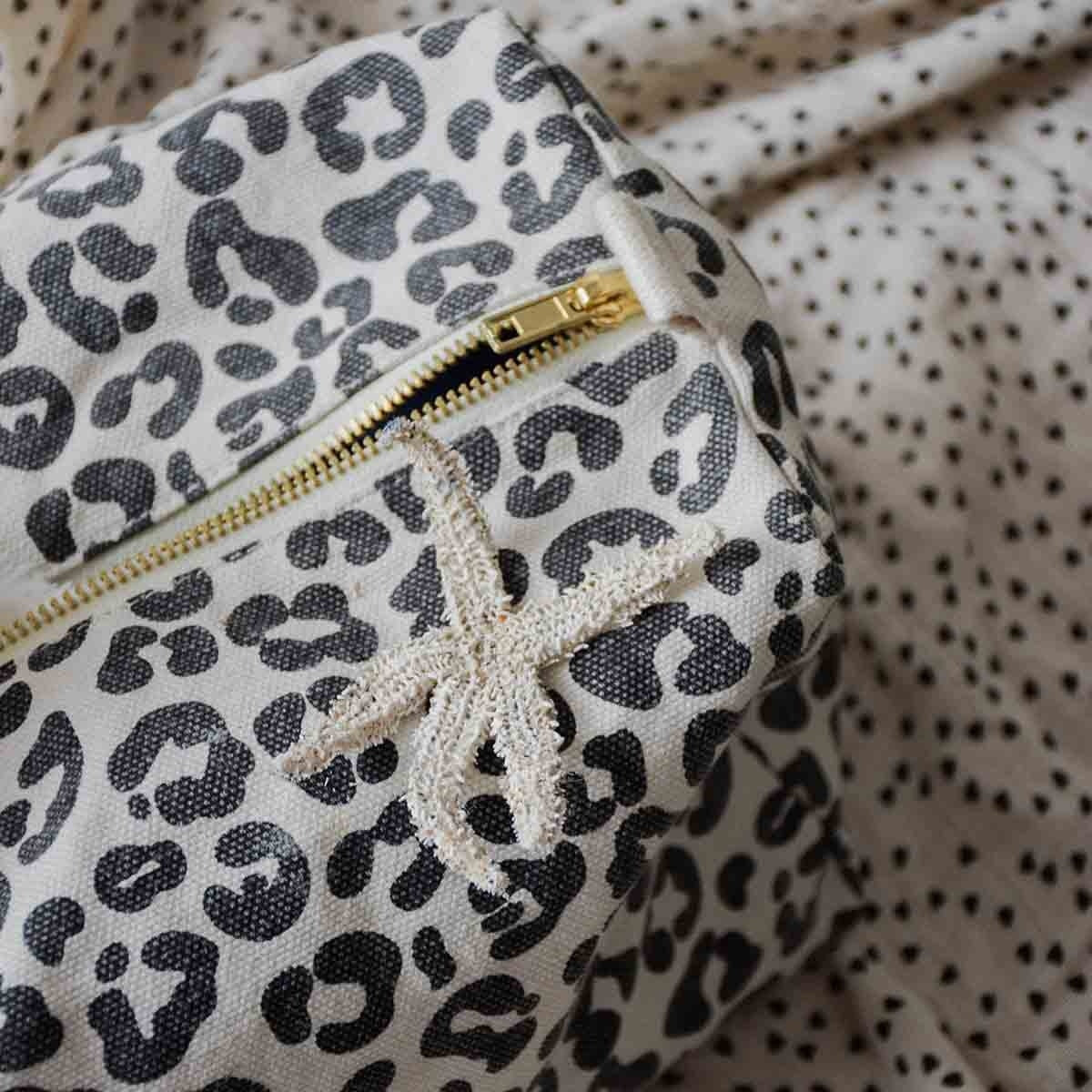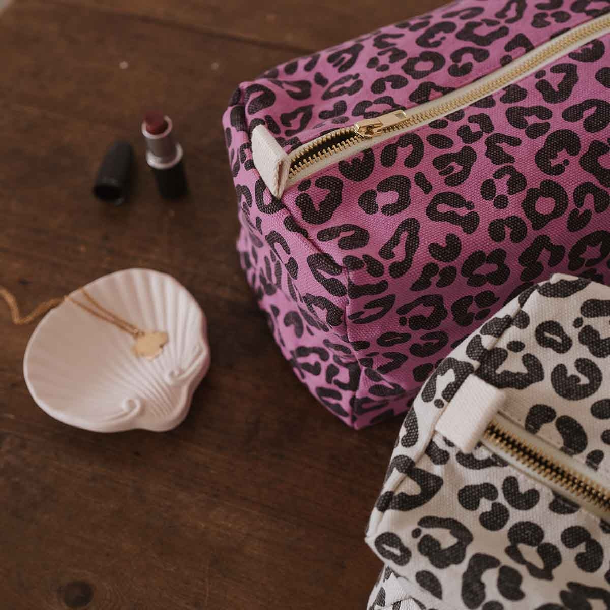 A pretty toiletry bag with a leopard pattern, or graou as the Rose in April brand says, on a gray/beige background.