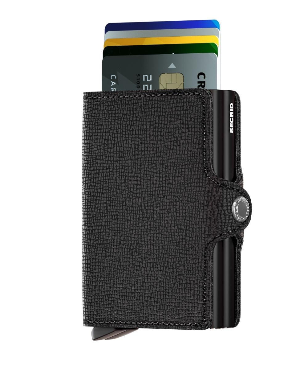 Twinwallet Secrid Crisple Black, European leather, 16-card capacity, RFID protection, button closure, modern and compact design. (Click Details for more information.)