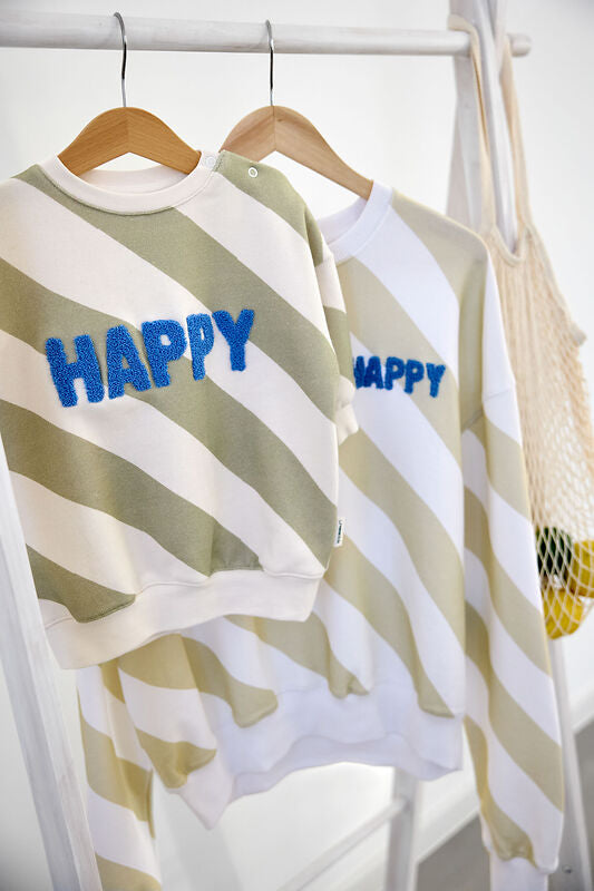 Fall for the Lassig organic cotton adult sweatshirt, with its trendy stripes and embroidered "Happy" message. A comfy and stylish must-have to match with kids' outfits!