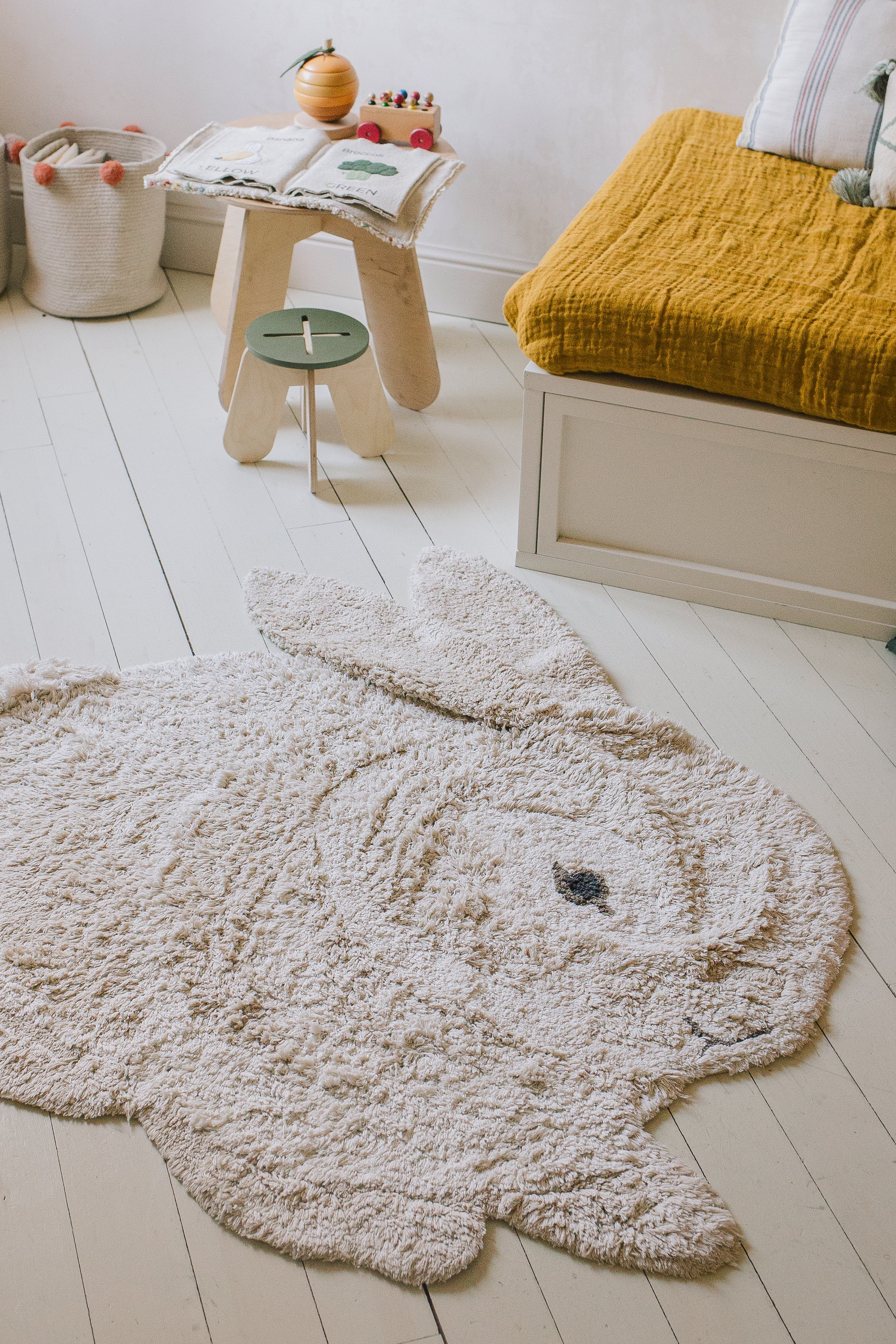 This washable rabbit rug is ideal for your child's bedroom. With its composition of 97% cotton and 3% other fibers, it offers both softness and resistance. Its dimensions of 130 x 135 cm make it a practical and decorative accessory for any child's bedroom.