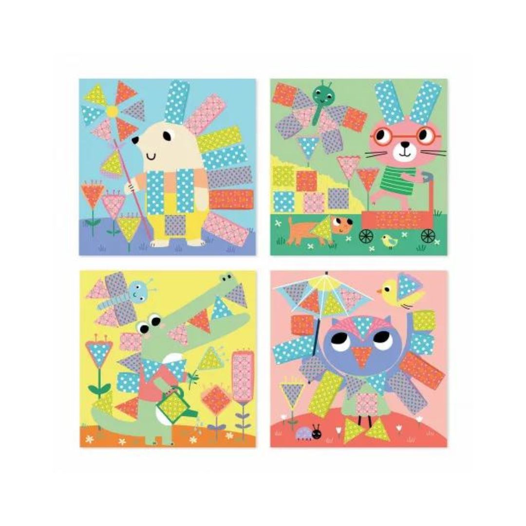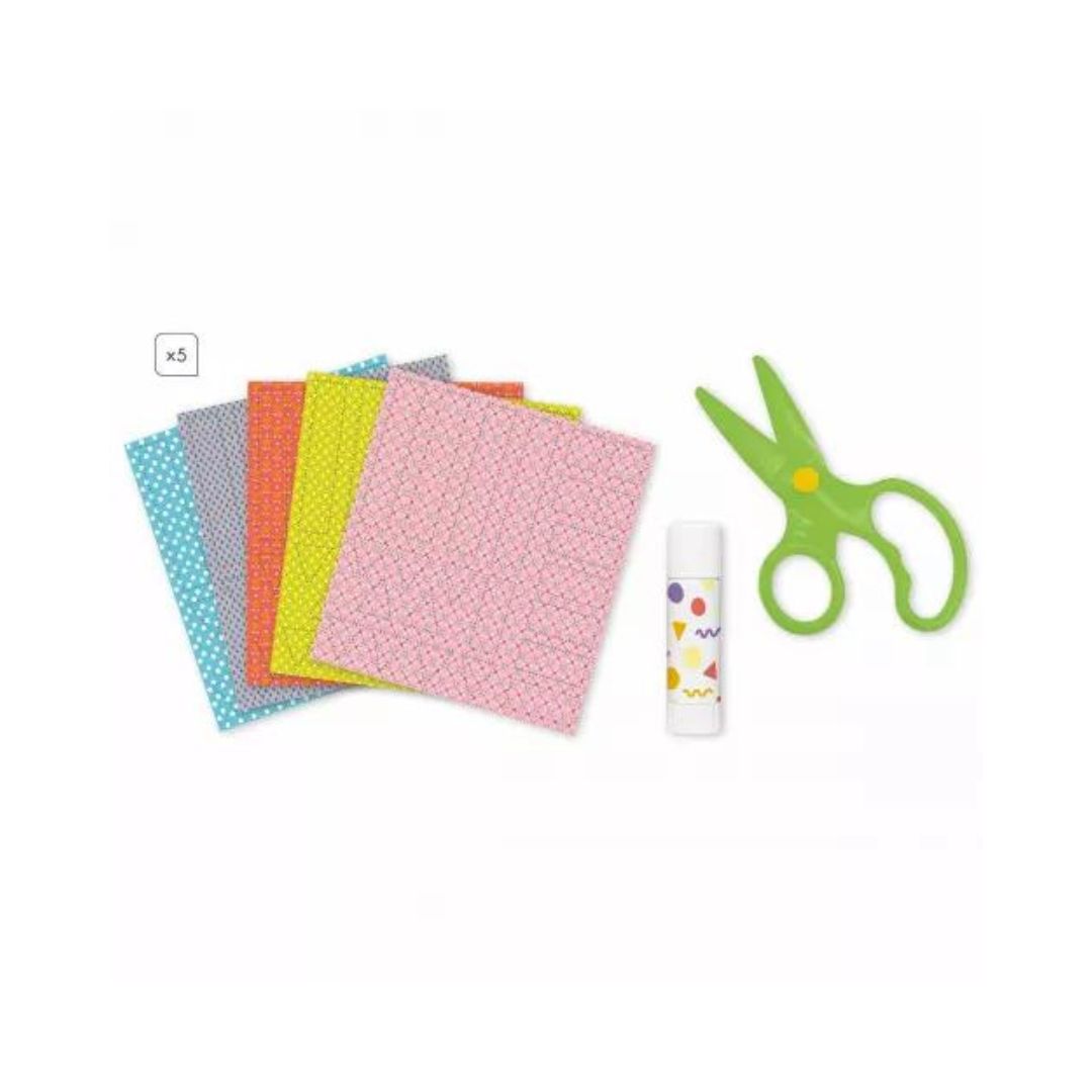 De kit bevat een aan kinderen aangepaste schaar (ze knippen alleen het papier), 4 plankjes, snijplanken en een tube lijm. Neem het mee op je weekend of vakantie!