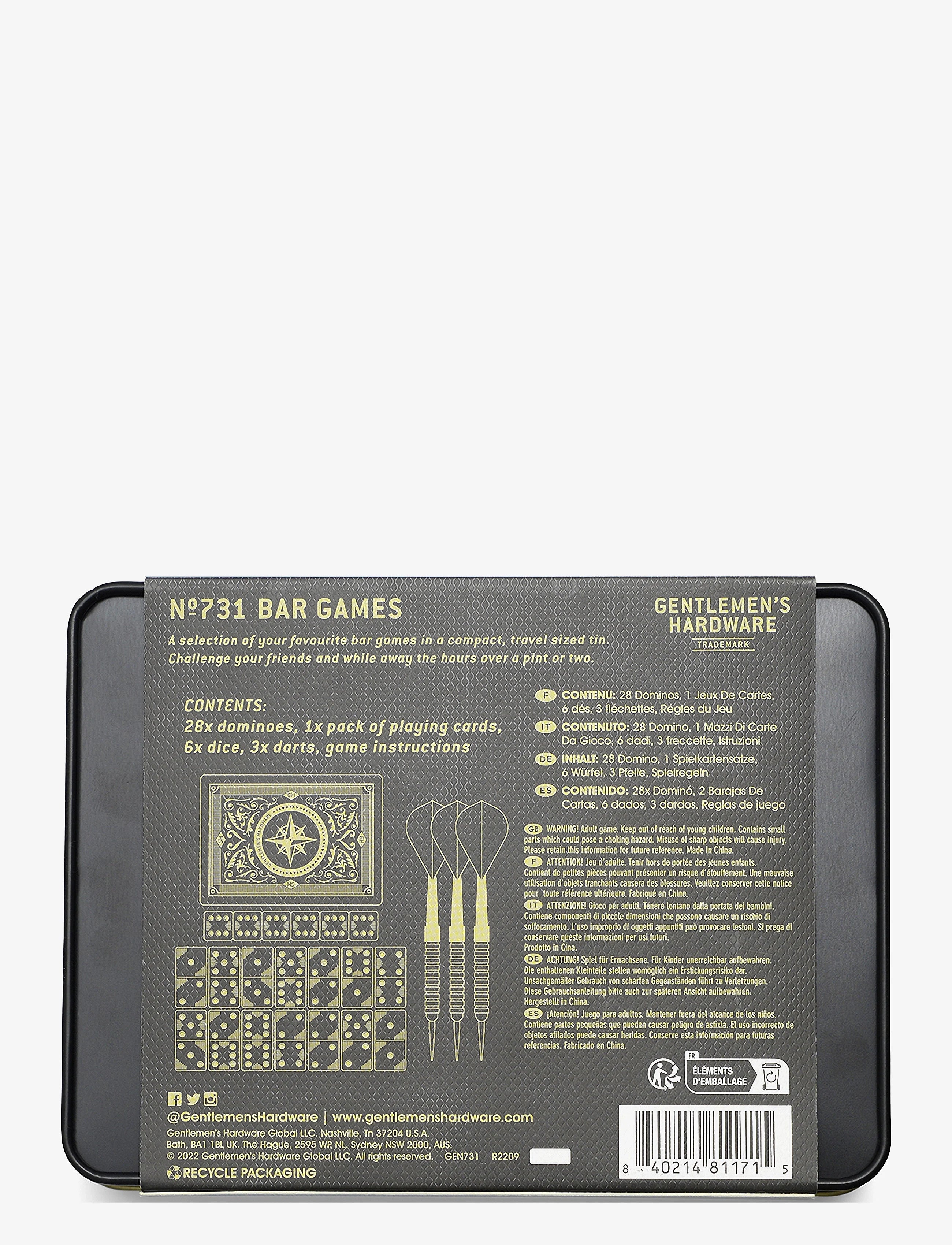De stevige metalen doos beschermt de spellen en maakt ze gemakkelijk op te bergen. De vintage stijl voegt een unieke en uitnodigende touch toe, die doet denken aan de sfeer van bars en levendige avonden.