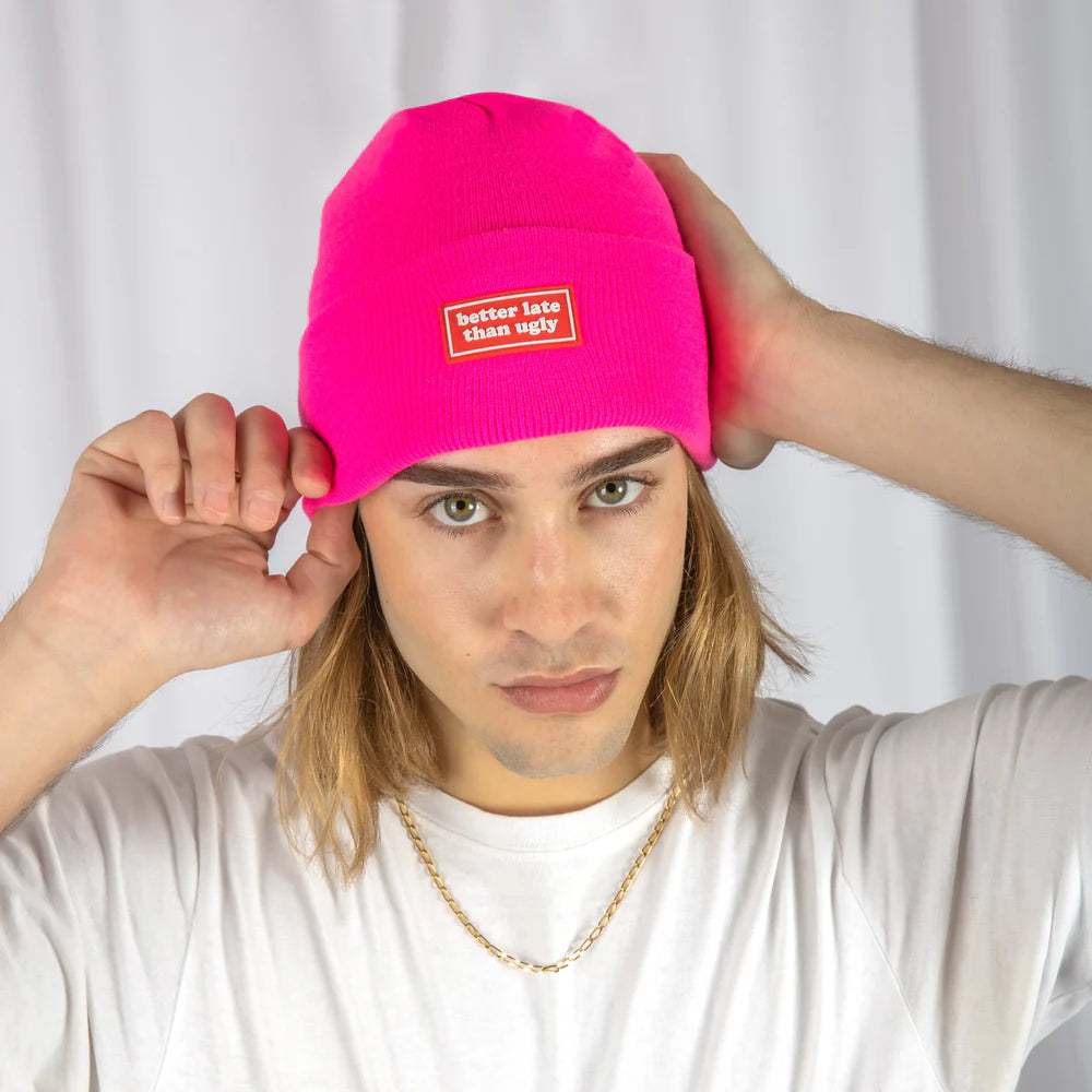 De neonroze "Better Late Than Ugly" muts houdt je oren warm met humor en stijl. Zacht, comfortabel en kleurrijk, perfect om de winter met persoonlijkheid tegemoet te treden.