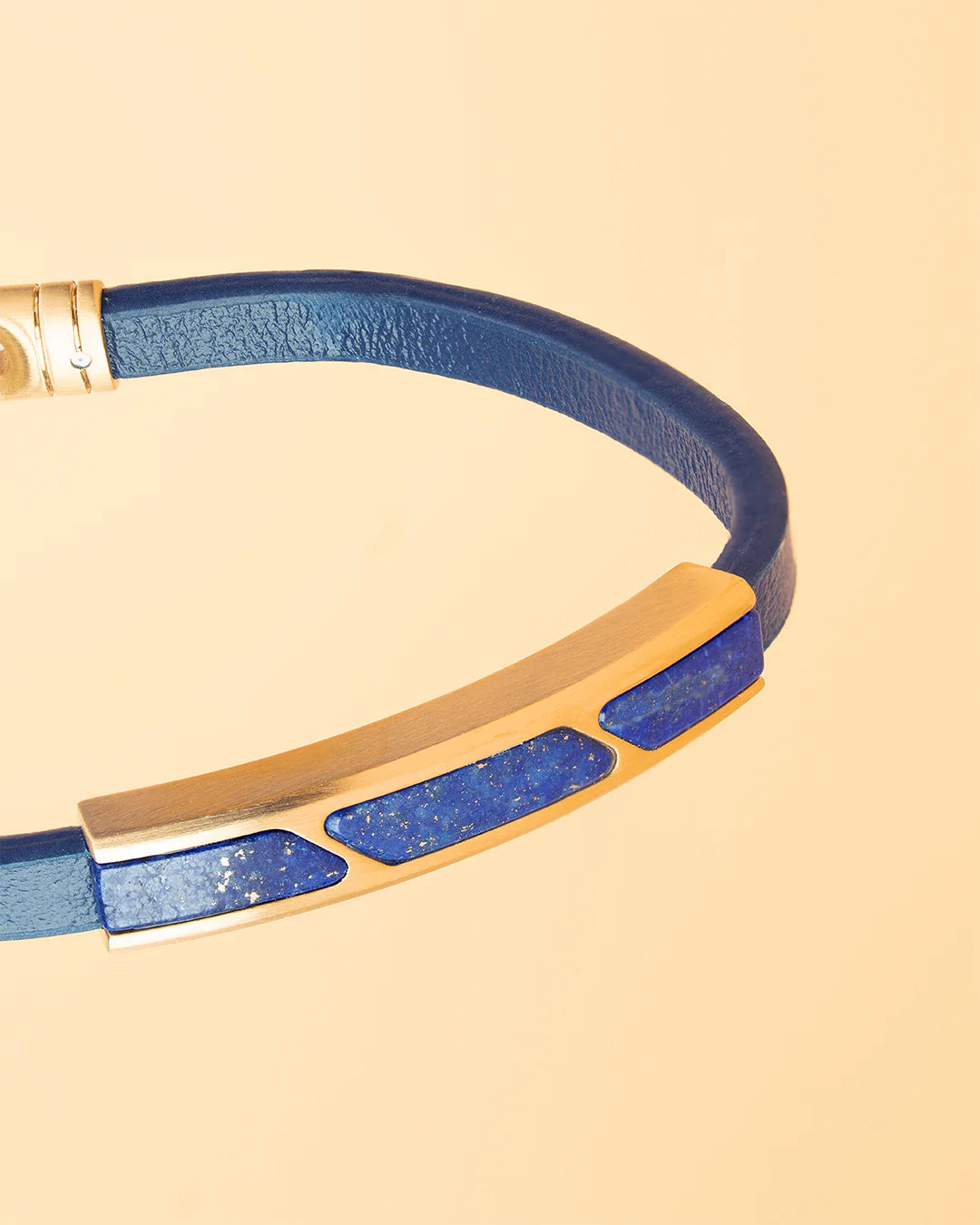 Voeg een vleugje verfijning toe aan je stijl met de Gemini Stella armband van blauw leer en blauwe lapis lazuli . Ontworpen voor de moderne man op zoek naar elegantie en betekenis, combineert dit sieraad de nobelheid van Italiaans leer met de mystieke diepte van lapis lazuli, ook wel de Steen van de Wijsheid genoemd.