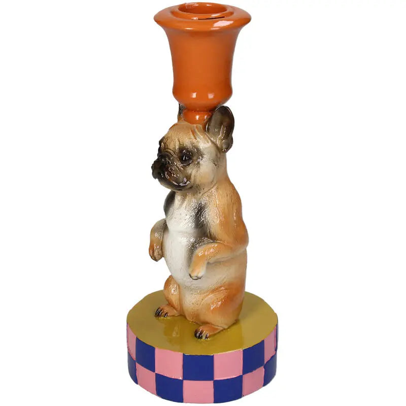 Het kleurrijke hondenontwerp en de zorgvuldige details maken het een speels maar elegant decoratief object , perfect om een plank, tafel of gezellig hoekje op te fleuren. Ideaal voor hondenliefhebbers en iedereen die van bijzondere decoratie houdt; deze kaarsenhouder tovert elk lichtje om in een warm en charmant moment .