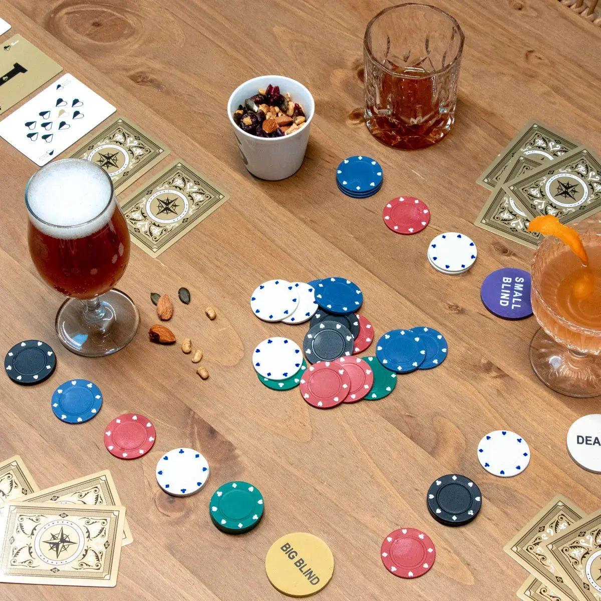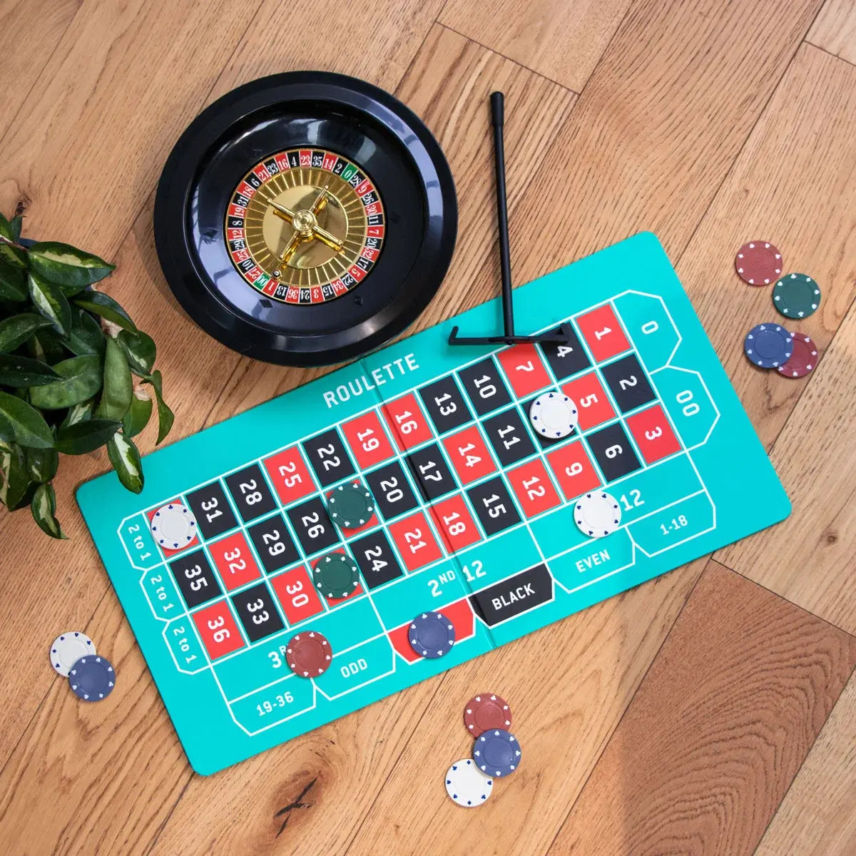 - Bevat: 1 bord (voorkant: roulette, achterkant: Texas Hold'em), 2 decks van 52 kaarten, 200 fiches, 1 roulettewiel, 2 rouletteballen, 1 dealerchip, 1 croupierstok en een instructieboekje.