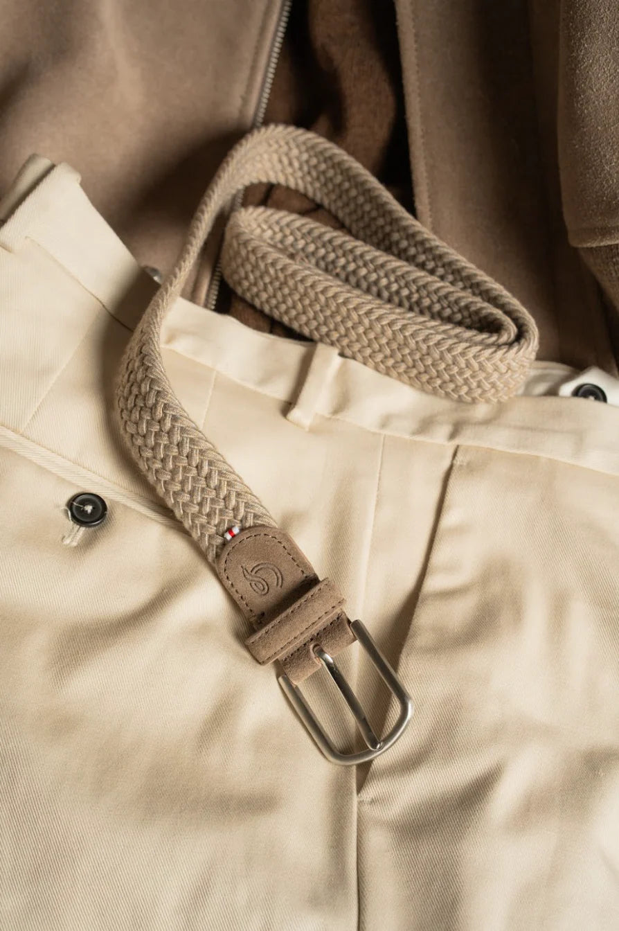 De Aberdeen riem combineert comfort en elegantie met zijn zachte kasjmierweefsel, suède details en roestvrijstalen gesp. Rekbaar en zonder gaatjes, biedt hij een perfecte pasvorm en een verfijnde stijl.