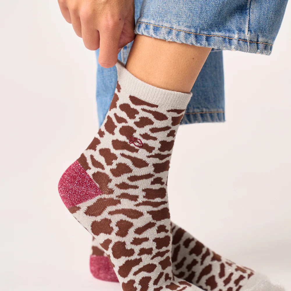 Maak een statement met een vleugje originaliteit dankzij deze glinsterende sokken met koeienprint . Met hun contrasterende bruin-witte kleuren en subtiele glinsterende details geven ze direct karakter aan je outfit, terwijl ze toch makkelijk elke dag te dragen zijn.