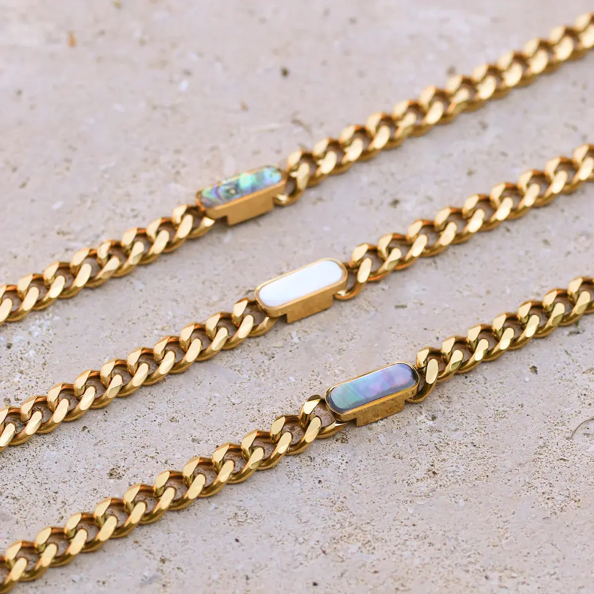 De Columba-lijn is een serie fijne vergulde sieraden van roestvrij staal die bestaan uit een grote netketting en een natuursteen.