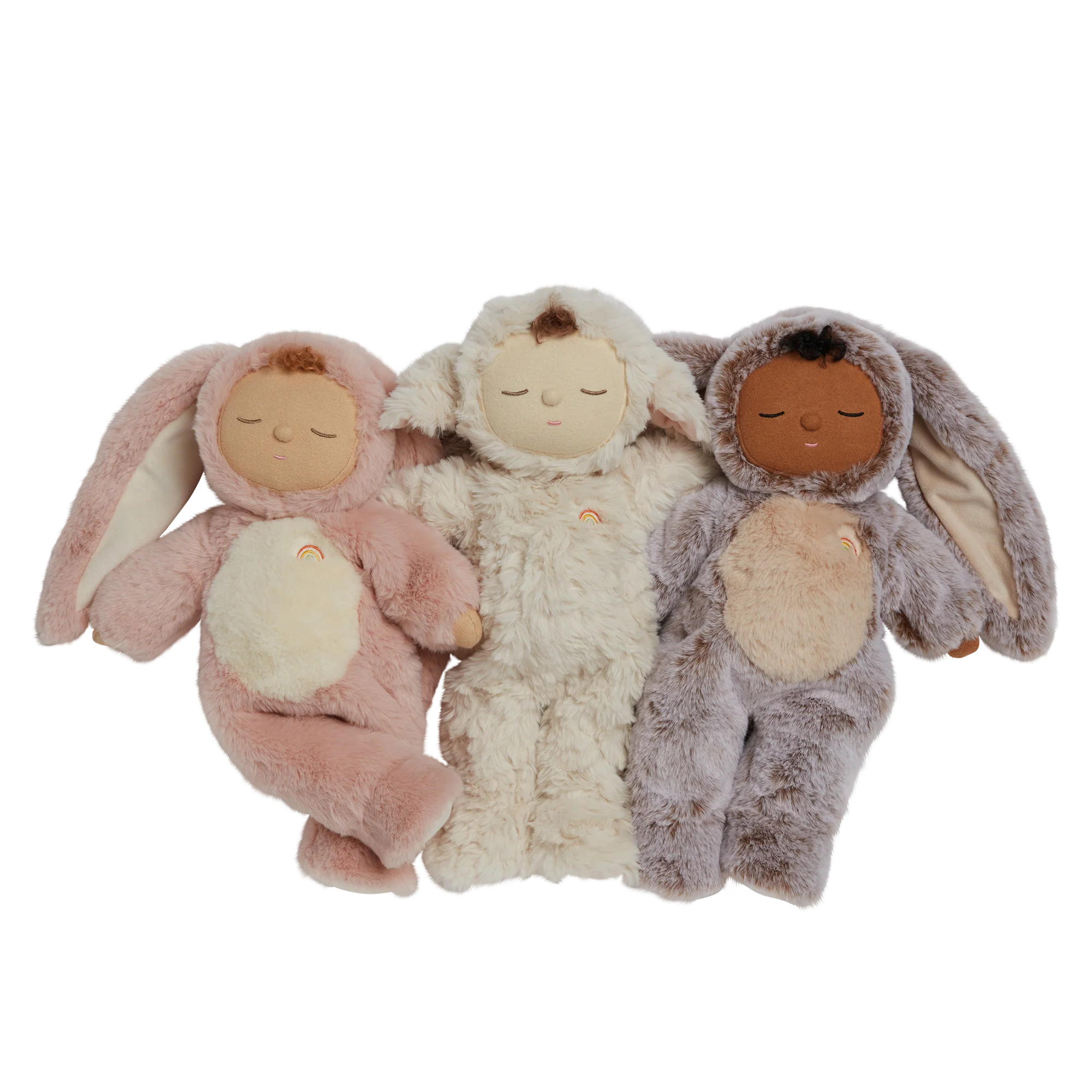 Olli Ella's Cozy Dinkums zijn kleine poppen gekleed als dieren, ultrazacht, licht van gewicht en ontworpen om baby's vanaf de geboorte te troosten. Gekleed in hun pluche (niet-verwijderbare) kostuums zijn ze poseerbaar, zacht en altijd klaar voor een knuffel. Elk detail is subtiel geborduurd, met een klein regenboogje op het hartje genaaid. Verpakt in een katoenen zakje, zijn ze het perfecte cadeau voor een pasgeborene of om een poppenfamilie uit te breiden. Een concentraat van tederheid en poëzie om dag en nacht bij je te houden.
