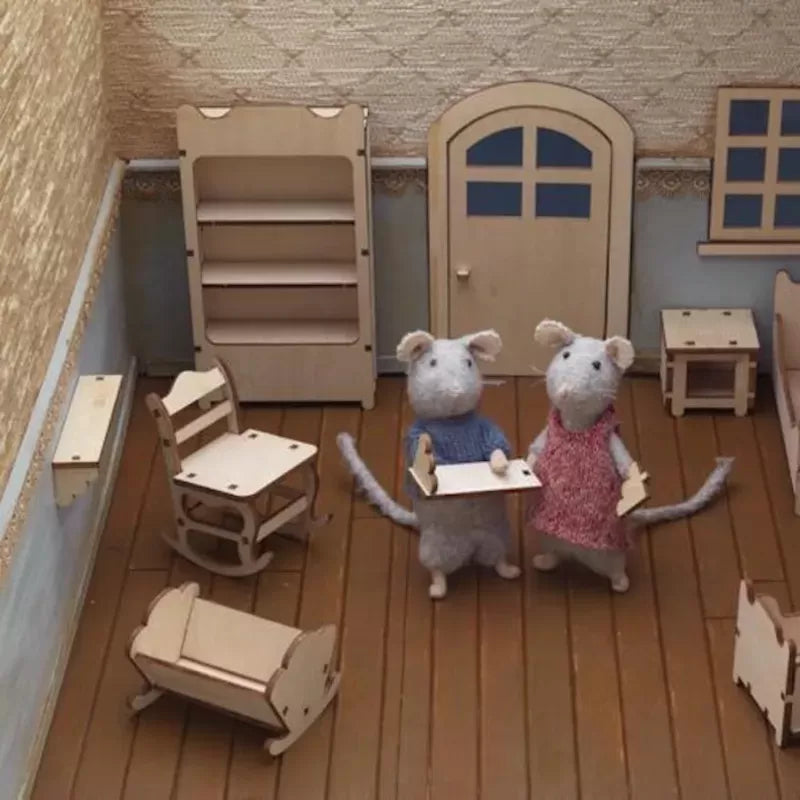 Met de woonkamermeubelset "Mouse Mansion" kunt u miniatuur-lasergesneden houten stukken maken. Ideaal voor Sam & Julia- fans, het bevat alles wat nodig is om een complete 3D-kinderkamer in elkaar te zetten. Dit is inbegrepen:
