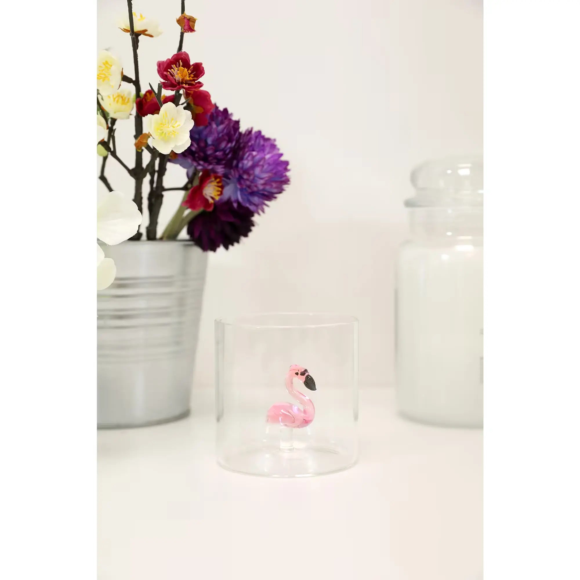 Meer dan zomaar een glas, het is een waar kunstwerk om vast te houden. Dit mondgeblazen borosilicaat Flamingo-glas verbergt een kleurrijke verrassing in het midden: een mondgeblazen glaselement, vervaardigd met finesse en speelsheid.