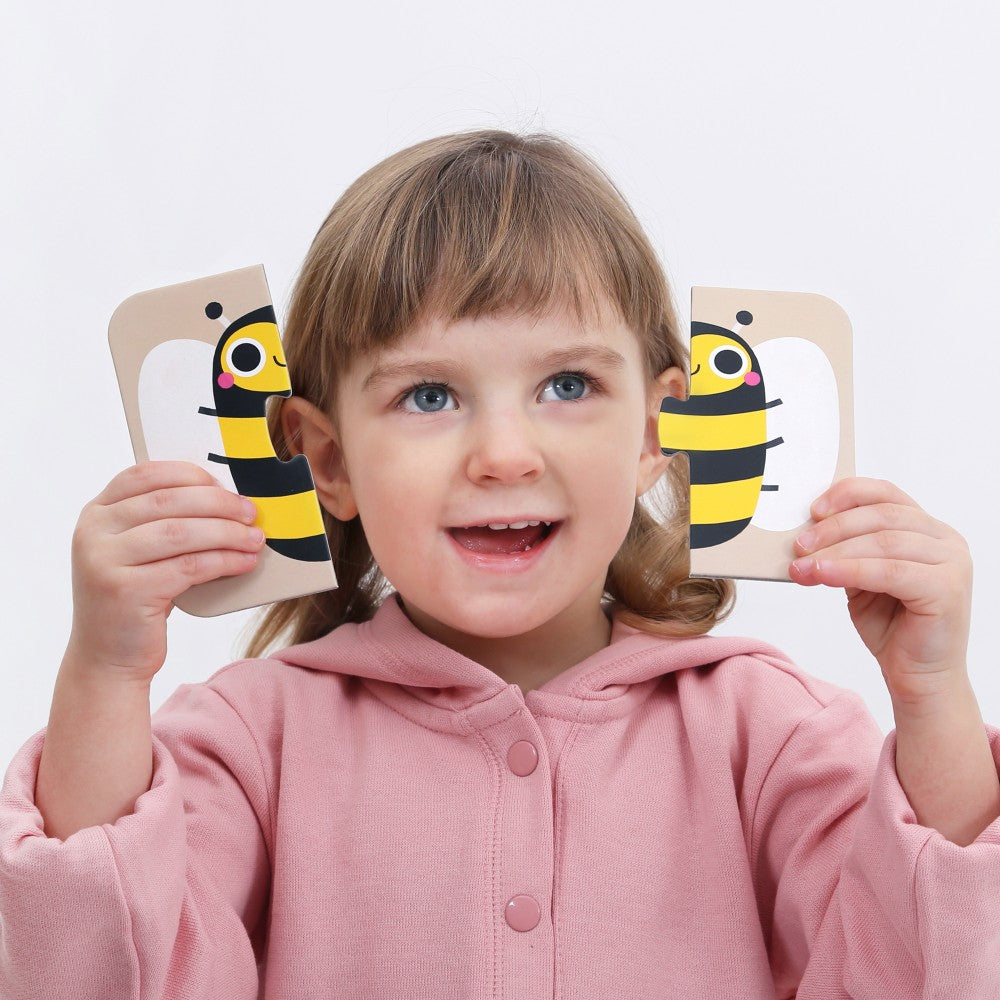 De doos bevat 8 puzzels van twee stukken, gemaakt van dik karton en makkelijk hanteerbaar. Je zet de dieren in elkaar, leert hun namen, verzint verhalen... en als je zin hebt om te spelen, kun je de stukjes zelfs mengen om denkbeeldige wezens te creëren! Een progressief, compact spel dat perfect is om in je tas te stoppen.