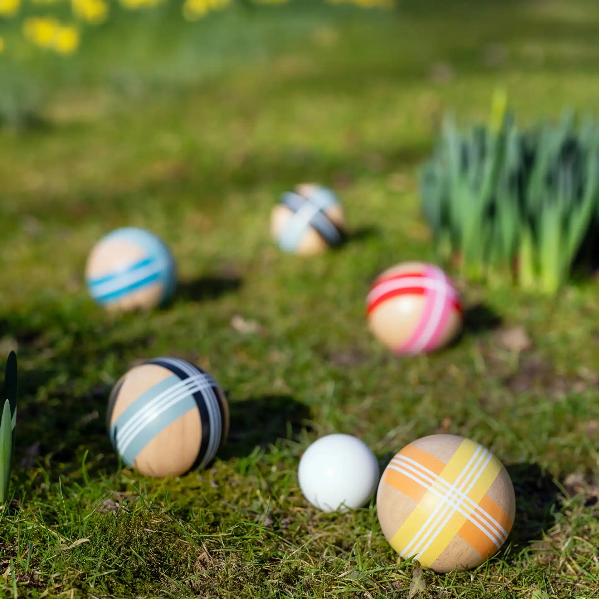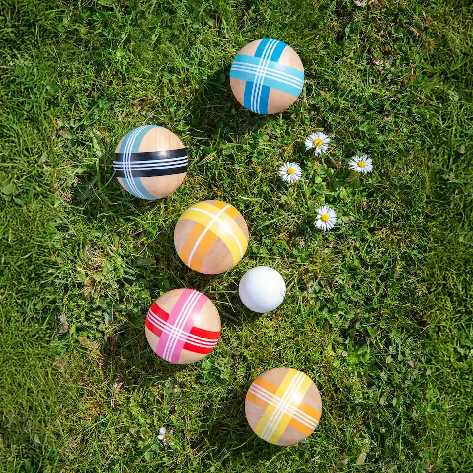 Met zijn 8 grote massief houten ballen versierd met een elegant strepenpatroon en het bijpassende kleine jackje, herleeft dit spel een geweldige klassieker in een even mooie als duurzame versie. Stevig, natuurlijk en tijdloos, ideaal om gezellige momenten te delen met familie of vrienden.